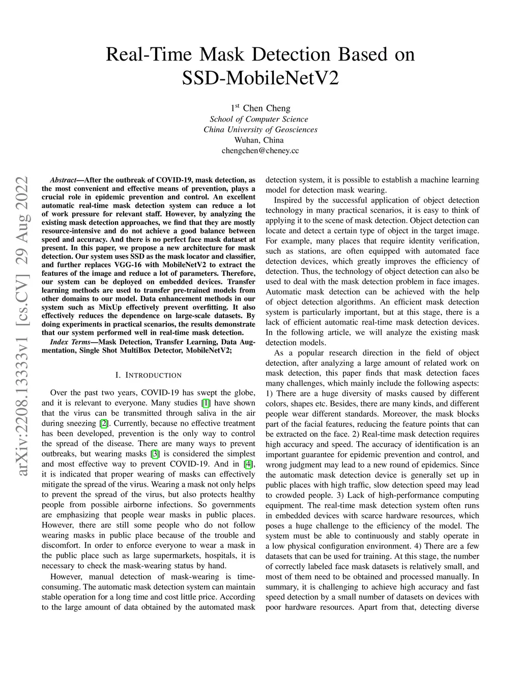 After the outbreak of COVID-19, mask detection, as the most convenient and effective means of prevention, plays a crucial role in epidemic prevention and control. An excellent automatic real-time mask detection system can reduce a lot of work pressure for relevant staff. However, by analyzing the existing mask detection approaches, we find that they are mostly resource-intensive and do not achieve a good balance between speed and accuracy. And there is no perfect face mask dataset at present. In this paper, we propose a new architecture for mask detection. Our system uses SSD as the mask locator and classifier, and further replaces VGG-16 with MobileNetV2 to extract the features of the image and reduce a lot of parameters. Therefore, our system can be deployed on embedded devices. Transfer learning methods are used to transfer pre-trained models from other domains to our model. Data enhancement methods in our system such as MixUp effectively prevent overfitting. It also effectively reduces the dependence on large-scale datasets. By doing experiments in practical scenarios, the results demonstrate that our system performed well in real-time mask detection.