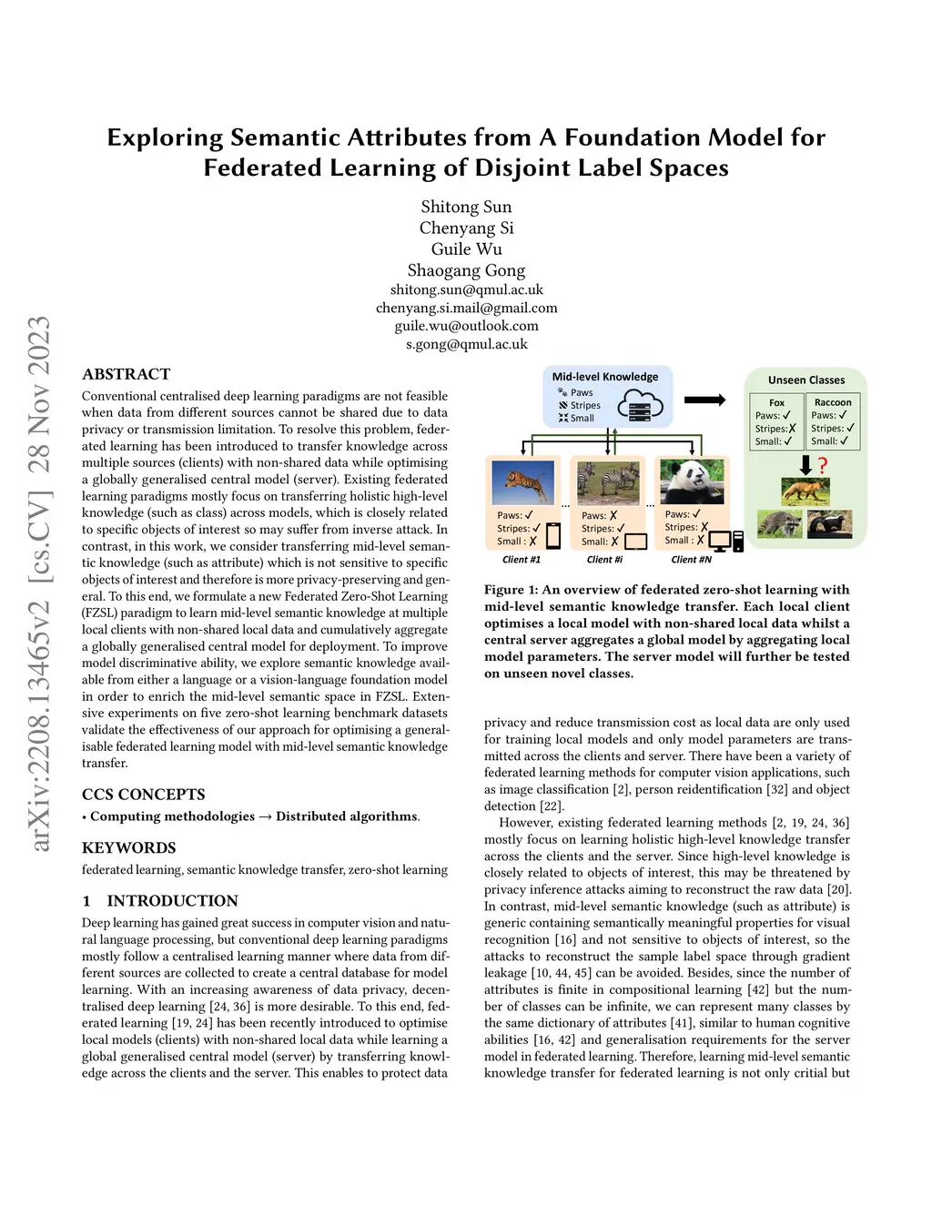 Conventional centralised deep learning paradigms are not feasible when data from different sources cannot be shared due to data privacy or transmission limitation. To resolve this problem, federated learning has been introduced to transfer knowledge across multiple sources (clients) with non-shared data while optimising a globally generalised central model (server). Existing federated learning paradigms mostly focus on transferring holistic high-level knowledge (such as class) across models, which are closely related to specific objects of interest so may suffer from inverse attack. In contrast, in this work, we consider transferring mid-level semantic knowledge (such as attribute) which is not sensitive to specific objects of interest and therefore is more privacy-preserving and scalable. To this end, we formulate a new Federated Zero-Shot Learning (FZSL) paradigm to learn mid-level semantic knowledge at multiple local clients with non-shared local data and cumulatively aggregate a globally generalised central model for deployment. To improve model discriminative ability, we propose to explore semantic knowledge augmentation from external knowledge for enriching the mid-level semantic space in FZSL. Extensive experiments on five zeroshot learning benchmark datasets validate the effectiveness of our approach for optimising a generalisable federated learning model with mid-level semantic knowledge transfer.