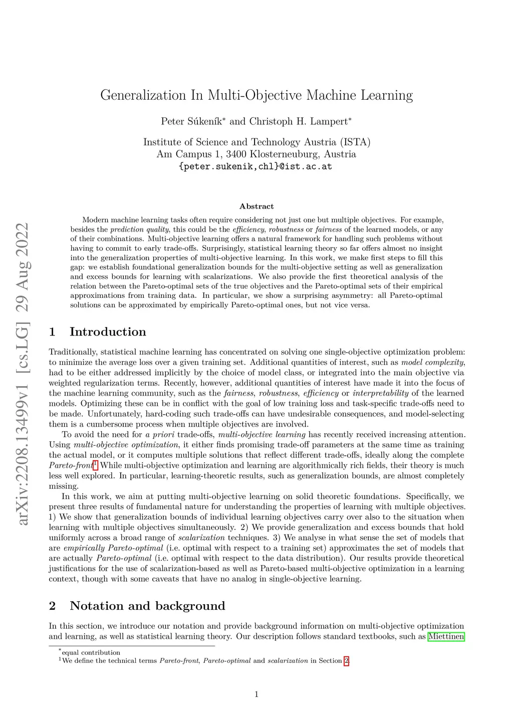 Modern machine learning tasks often require considering not just one but multiple objectives. For example, besides the prediction quality, this could be the efficiency, robustness or fairness of the learned models, or any of their combinations. Multi-objective learning offers a natural framework for handling such problems without having to commit to early trade-offs. Surprisingly, statistical learning theory so far offers almost no insight into the generalization properties of multi-objective learning. In this work, we make first steps to fill this gap: we establish foundational generalization bounds for the multi-objective setting as well as generalization and excess bounds for learning with scalarizations. We also provide the first theoretical analysis of the relation between the Pareto-optimal sets of the true objectives and the Pareto-optimal sets of their empirical approximations from training data. In particular, we show a surprising asymmetry: all Pareto-optimal solutions can be approximated by empirically Pareto-optimal ones, but not vice versa.