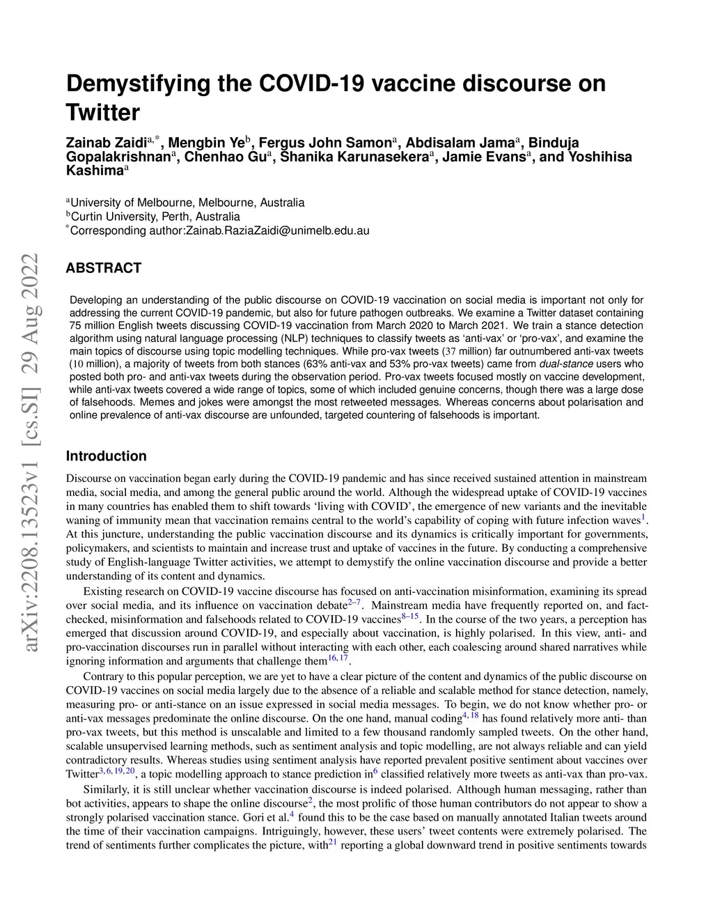 Developing an understanding of the public discourse on COVID-19 vaccination on social media is important not only for addressing the current COVID-19 pandemic, but also for future pathogen outbreaks. We examine a Twitter dataset containing 75 million English tweets discussing COVID-19 vaccination from March 2020 to March 2021. We train a stance detection algorithm using natural language processing (NLP) techniques to classify tweets as `anti-vax' or `pro-vax', and examine the main topics of discourse using topic modelling techniques. While pro-vax tweets (37 million) far outnumbered anti-vax tweets (10 million), a majority of tweets from both stances (63% anti-vax and 53% pro-vax tweets) came from dual-stance users who posted both pro- and anti-vax tweets during the observation period. Pro-vax tweets focused mostly on vaccine development, while anti-vax tweets covered a wide range of topics, some of which included genuine concerns, though there was a large dose of falsehoods. A number of topics were common to both stances, though pro- and anti-vax tweets discussed them from opposite viewpoints. Memes and jokes were amongst the most retweeted messages. Whereas concerns about polarisation and online prevalence of anti-vax discourse are unfounded, targeted countering of falsehoods is important.