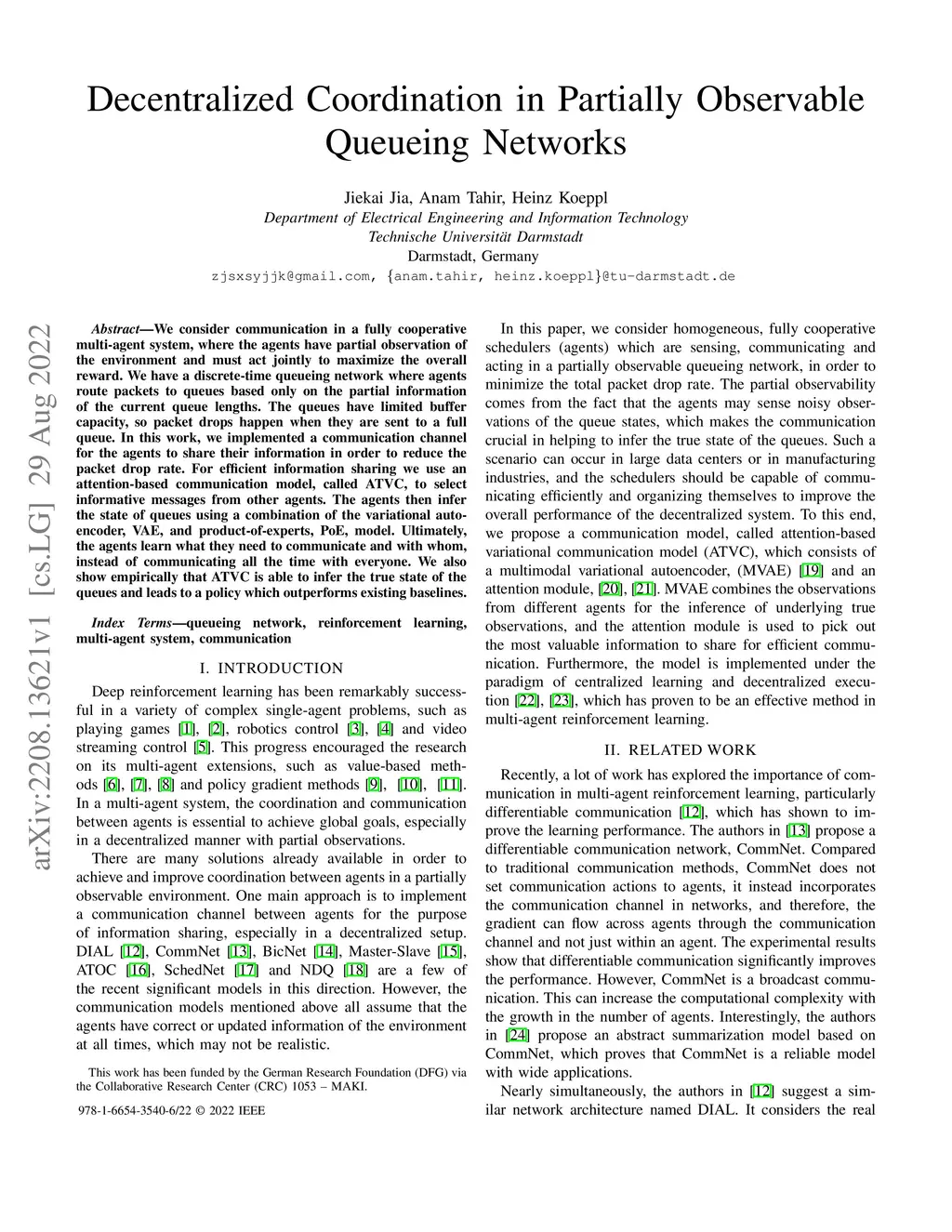 We consider communication in a fully cooperative multi-agent system, where the agents have partial observation of the environment and must act jointly to maximize the overall reward. We have a discrete-time queueing network where agents route packets to queues based only on the partial information of the current queue lengths. The queues have limited buffer capacity, so packet drops happen when they are sent to a full queue. In this work, we implemented a communication channel for the agents to share their information in order to reduce the packet drop rate. For efficient information sharing we use an attention-based communication model, called ATVC, to select informative messages from other agents. The agents then infer the state of queues using a combination of the variational auto-encoder, VAE, and product-of-experts, PoE, model. Ultimately, the agents learn what they need to communicate and with whom, instead of communicating all the time with everyone. We also show empirically that ATVC is able to infer the true state of the queues and leads to a policy which outperforms existing baselines.