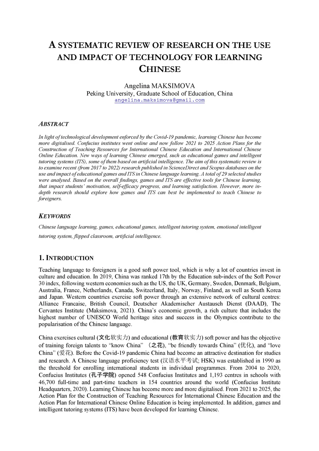 In light of technological development enforced by the pandemic, learning Chinese has become more digitalised. Confucius institutes went online and now follow 2021 to 2025 Action Plans for the Construction of Teaching Resources for International Chinese Education and International Chinese Online Education. New ways of learning Chinese emerged, such as educational games and intelligent tutoring systems ITS, some of them based on artificial intelligence. The aim of this systematic review is to examine recent research published in ScienceDirect and Scopus databases on the use and impact of educational games and ITS in Chinese language learning. A total of 29 selected studies were analysed.