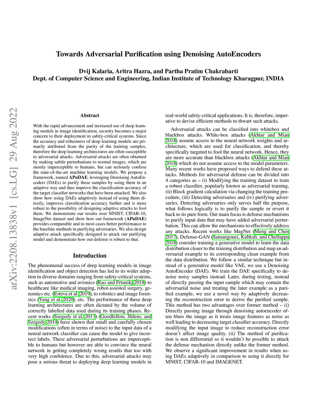 With the rapid advancement and increased use of deep learning models in image identification, security becomes a major concern to their deployment in safety-critical systems. Since the accuracy and robustness of deep learning models are primarily attributed from the purity of the training samples, therefore the deep learning architectures are often susceptible to adversarial attacks. Adversarial attacks are often obtained by making subtle perturbations to normal images, which are mostly imperceptible to humans, but can seriously confuse the state-of-the-art machine learning models. We propose a framework, named APuDAE, leveraging Denoising AutoEncoders (DAEs) to purify these samples by using them in an adaptive way and thus improve the classification accuracy of the target classifier networks that have been attacked. We also show how using DAEs adaptively instead of using them directly, improves classification accuracy further and is more robust to the possibility of designing adaptive attacks to fool them. We demonstrate our results over MNIST, CIFAR-10, ImageNet dataset and show how our framework (APuDAE) provides comparable and in most cases better performance to the baseline methods in purifying adversaries. We also design adaptive attack specifically designed to attack our purifying model and demonstrate how our defense is robust to that.