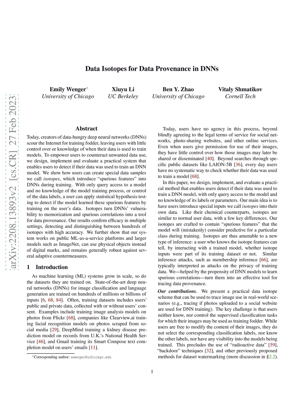 Today, creators of data-hungry deep neural networks (DNNs) scour the Internet for training fodder, leaving users with little control over or knowledge of when their data is appropriated for model training. To empower users to counteract unwanted data use, we design, implement and evaluate a practical system that enables users to detect if their data was used to train an DNN model. We show how users can create special data points we call isotopes, which introduce "spurious features" into DNNs during training. With only query access to a trained model and no knowledge of the model training process, or control of the data labels, a user can apply statistical hypothesis testing to detect if a model has learned the spurious features associated with their isotopes by training on the user's data. This effectively turns DNNs' vulnerability to memorization and spurious correlations into a tool for data provenance. Our results confirm efficacy in multiple settings, detecting and distinguishing between hundreds of isotopes with high accuracy. We further show that our system works on public ML-as-a-service platforms and larger models such as ImageNet, can use physical objects instead of digital marks, and remains generally robust against several adaptive countermeasures.