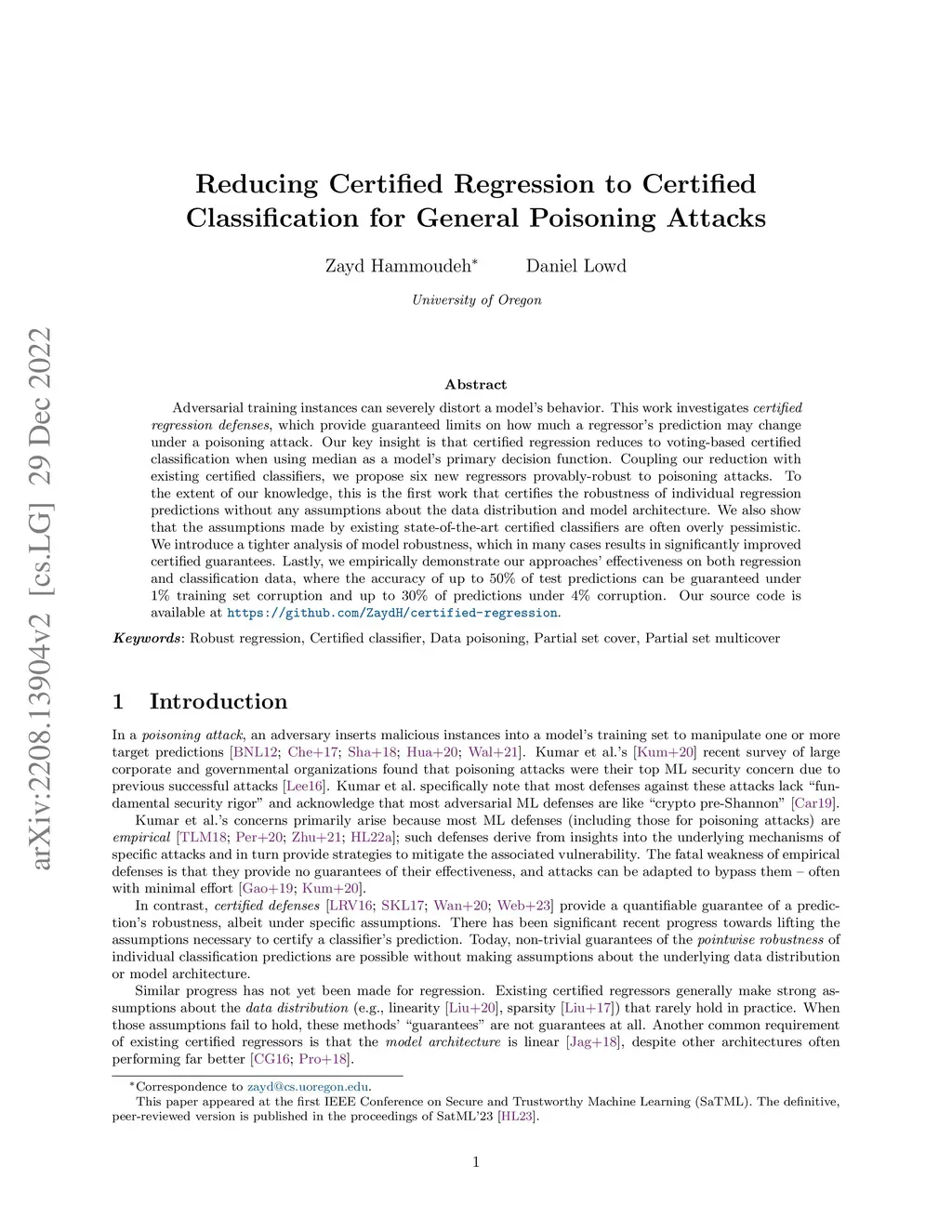 Adversarial training instances can severely distort a model's behavior. This work investigates certified regression defenses, which provide guaranteed limits on how much a regressor's prediction may change under a poisoning attack. Our key insight is that certified regression reduces to voting-based certified classification when using median as a model's primary decision function. Coupling our reduction with existing certified classifiers, we propose six new regressors provably-robust to poisoning attacks. To the extent of our knowledge, this is the first work that certifies the robustness of individual regression predictions without any assumptions about the data distribution and model architecture. We also show that the assumptions made by existing state-of-the-art certified classifiers are often overly pessimistic. We introduce a tighter analysis of model robustness, which in many cases results in significantly improved certified guarantees. Lastly, we empirically demonstrate our approaches' effectiveness on both regression and classification data, where the accuracy of up to 50% of test predictions can be guaranteed under 1% training set corruption and up to 30% of predictions under 4% corruption. Our source code is available at https://github.com/ZaydH/certified-regression.