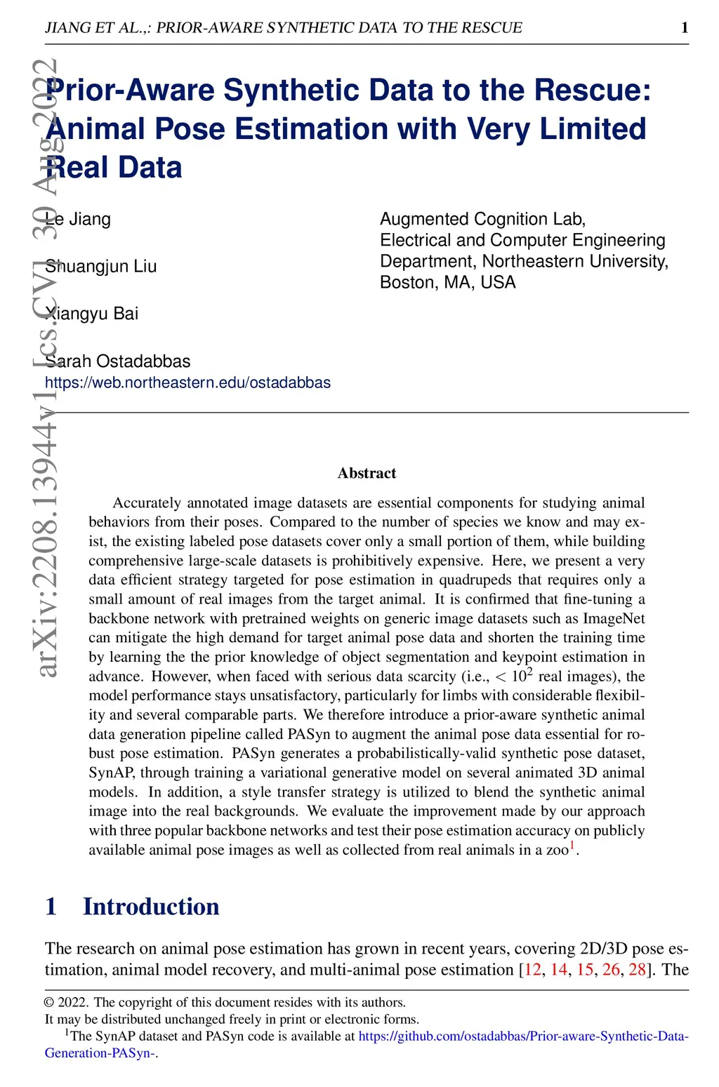 Accurately annotated image datasets are essential components for studying animal behaviors from their poses. Compared to the number of species we know and may exist, the existing labeled pose datasets cover only a small portion of them, while building comprehensive large-scale datasets is prohibitively expensive. Here, we present a very data efficient strategy targeted for pose estimation in quadrupeds that requires only a small amount of real images from the target animal. It is confirmed that fine-tuning a backbone network with pretrained weights on generic image datasets such as ImageNet can mitigate the high demand for target animal pose data and shorten the training time by learning the the prior knowledge of object segmentation and keypoint estimation in advance. However, when faced with serious data scarcity (i.e., real images), the model performance stays unsatisfactory, particularly for limbs with considerable flexibility and several comparable parts. We therefore introduce a prior-aware synthetic animal data generation pipeline called PASyn to augment the animal pose data essential for robust pose estimation. PASyn generates a probabilistically-valid synthetic pose dataset, SynAP, through training a variational generative model on several animated 3D animal models. In addition, a style transfer strategy is utilized to blend the synthetic animal image into the real backgrounds. We evaluate the improvement made by our approach with three popular backbone networks and test their pose estimation accuracy on publicly available animal pose images as well as collected from real animals in a zoo.