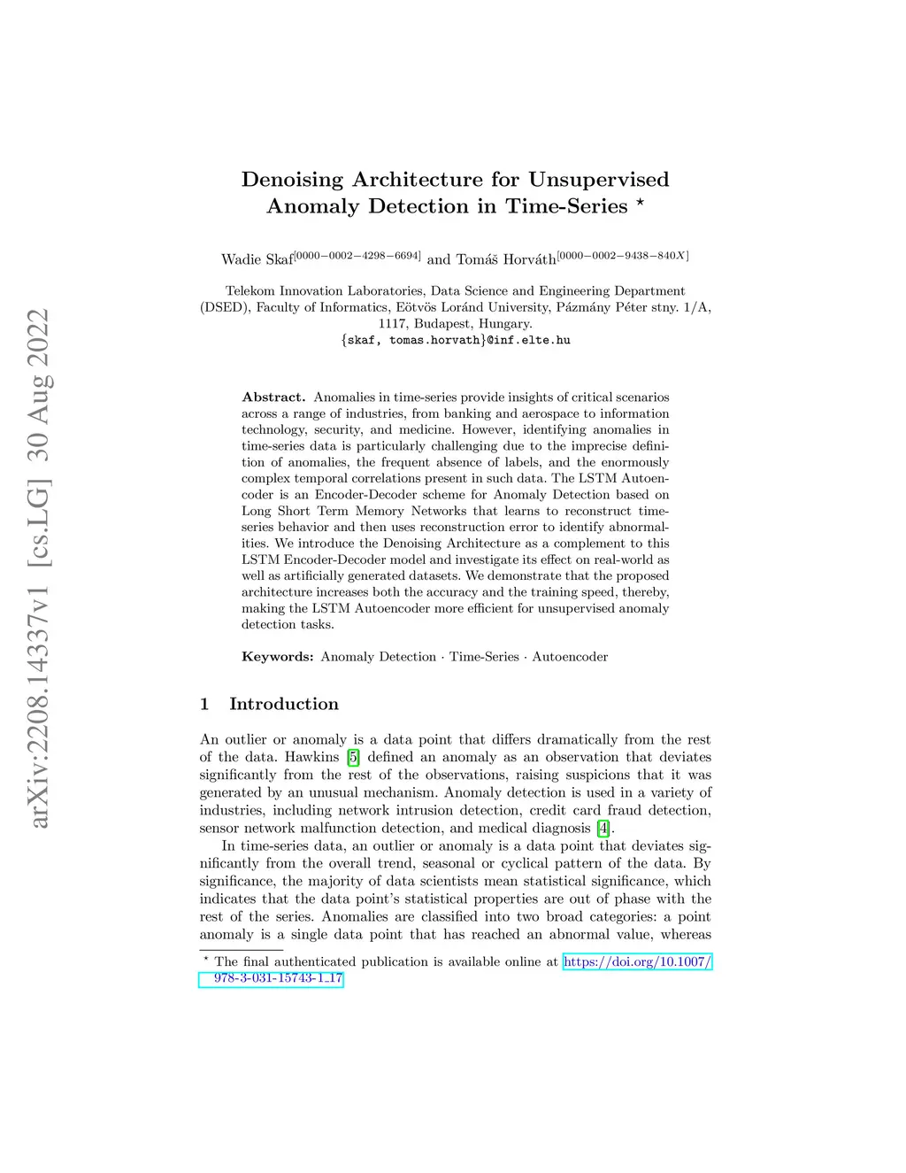Denoising Architecture for Unsupervised Anomaly Detection in Time-Series