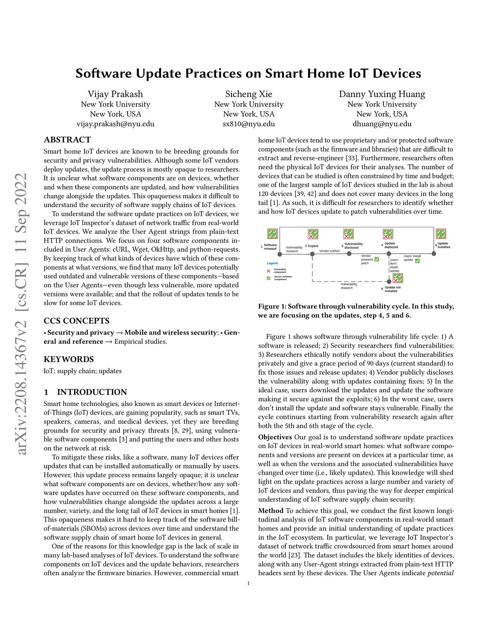 Smart home IoT devices are known to be breeding grounds for security and privacy vulnerabilities. Although some IoT vendors deploy updates, the update process is mostly opaque to researchers. It is unclear what software components are on devices, whether and when these components are updated, and how vulnerabilities change alongside the updates. This opaqueness makes it difficult to understand the security of software supply chains of IoT devices. To understand the software update practices on IoT devices, we leverage IoT Inspector's dataset of network traffic from real-world IoT devices. We analyze the User Agent strings from plain-text HTTP connections. We focus on four software components included in User Agents: cURL, Wget, OkHttp, and python-requests. By keeping track of what kinds of devices have which of these components at what versions, we find that many IoT devices potentially used outdated and vulnerable versions of these components - based on the User Agents - even though less vulnerable, more updated versions were available; and that the rollout of updates tends to be slow for some IoT devices.