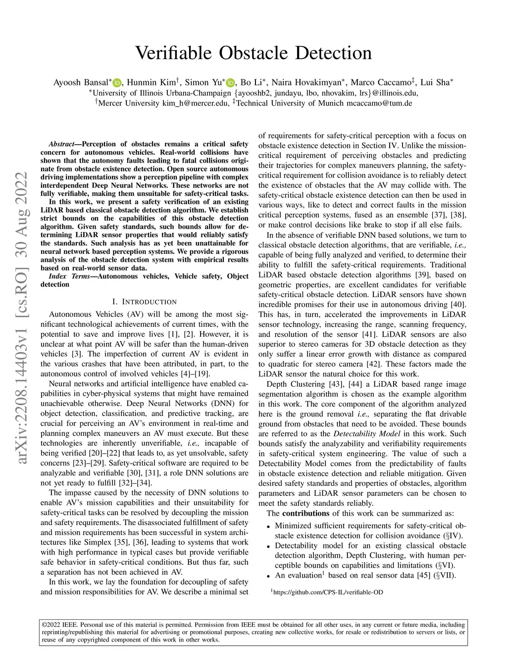 Perception of obstacles remains a critical safety concern for autonomous vehicles. Real-world collisions have shown that the autonomy faults leading to fatal collisions originate from obstacle existence detection. Open source autonomous driving implementations show a perception pipeline with complex interdependent Deep Neural Networks. These networks are not fully verifiable, making them unsuitable for safety-critical tasks. In this work, we present a safety verification of an existing LiDAR based classical obstacle detection algorithm. We establish strict bounds on the capabilities of this obstacle detection algorithm. Given safety standards, such bounds allow for determining LiDAR sensor properties that would reliably satisfy the standards. Such analysis has as yet been unattainable for neural network based perception systems. We provide a rigorous analysis of the obstacle detection system with empirical results based on real-world sensor data.