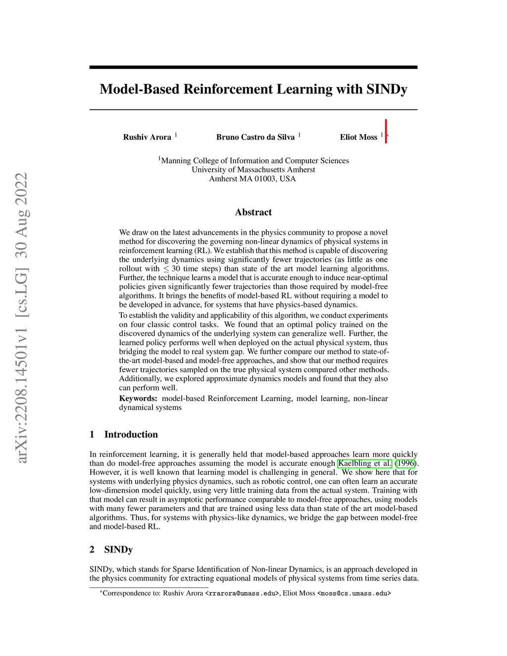 We draw on the latest advancements in the physics community to propose a novel method for discovering the governing non-linear dynamics of physical systems in reinforcement learning (RL). We establish that this method is capable of discovering the underlying dynamics using significantly fewer trajectories (as little as one rollout with time steps) than state of the art model learning algorithms. Further, the technique learns a model that is accurate enough to induce near-optimal policies given significantly fewer trajectories than those required by model-free algorithms. It brings the benefits of model-based RL without requiring a model to be developed in advance, for systems that have physics-based dynamics. To establish the validity and applicability of this algorithm, we conduct experiments on four classic control tasks. We found that an optimal policy trained on the discovered dynamics of the underlying system can generalize well. Further, the learned policy performs well when deployed on the actual physical system, thus bridging the model to real system gap. We further compare our method to state-of-the-art model-based and model-free approaches, and show that our method requires fewer trajectories sampled on the true physical system compared other methods. Additionally, we explored approximate dynamics models and found that they also can perform well.