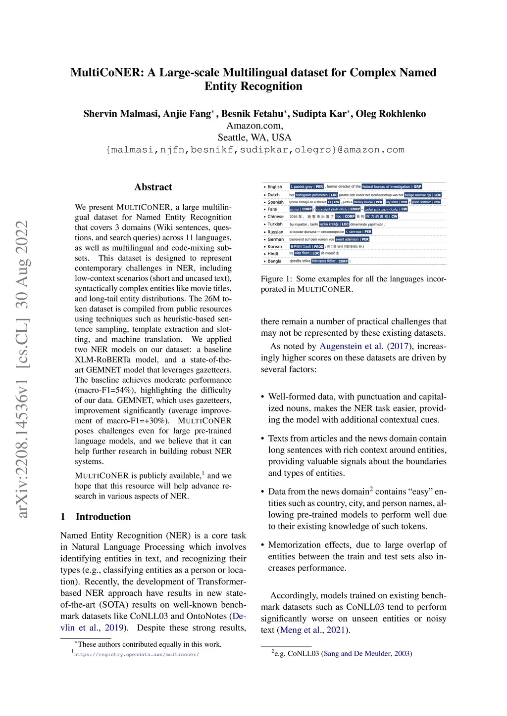 We present MultiCoNER, a large multilingual dataset for Named Entity Recognition that covers 3 domains (Wiki sentences, questions, and search queries) across 11 languages, as well as multilingual and code-mixing subsets. This dataset is designed to represent contemporary challenges in NER, including low-context scenarios (short and uncased text), syntactically complex entities like movie titles, and long-tail entity distributions. The 26M token dataset is compiled from public resources using techniques such as heuristic-based sentence sampling, template extraction and slotting, and machine translation. We applied two NER models on our dataset: a baseline XLM-RoBERTa model, and a state-of-the-art GEMNET model that leverages gazetteers. The baseline achieves moderate performance (macro-F1=54%), highlighting the difficulty of our data. GEMNET, which uses gazetteers, improvement significantly (average improvement of macro-F1=+30%). MultiCoNER poses challenges even for large pre-trained language models, and we believe that it can help further research in building robust NER systems. MultiCoNER is publicly available at https://registry.opendata.aws/multiconer/ and we hope that this resource will help advance research in various aspects of NER.