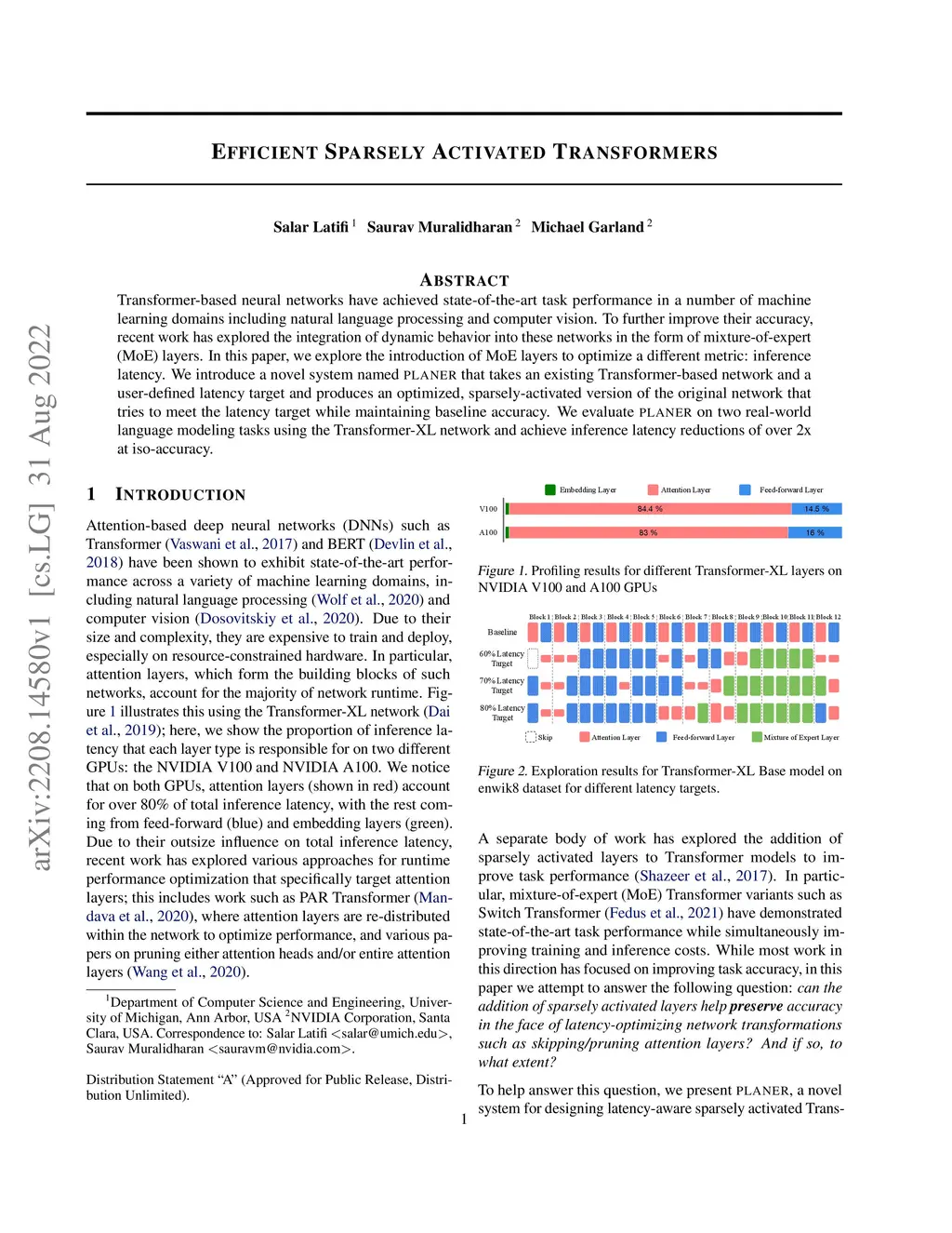 Transformer-based neural networks have achieved state-of-the-art task performance in a number of machine learning domains including natural language processing and computer vision. To further improve their accuracy, recent work has explored the integration of dynamic behavior into these networks in the form of mixture-of-expert (MoE) layers. In this paper, we explore the introduction of MoE layers to optimize a different metric: inference latency. We introduce a novel system named PLANER that takes an existing Transformer-based network and a user-defined latency target and produces an optimized, sparsely-activated version of the original network that tries to meet the latency target while maintaining baseline accuracy. We evaluate PLANER on two real-world language modeling tasks using the Transformer-XL network and achieve inference latency reductions of over 2x at iso-accuracy.