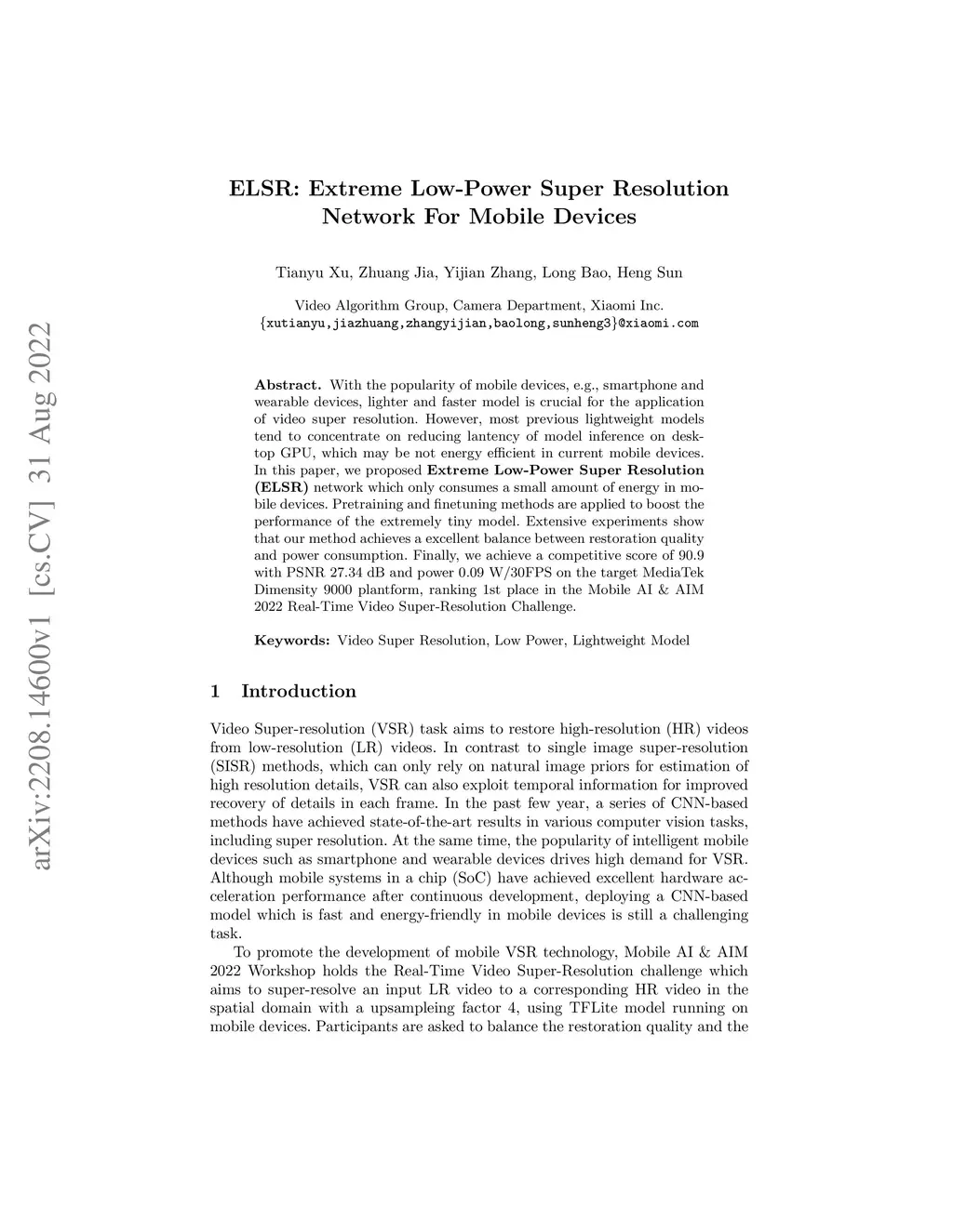 With the popularity of mobile devices, e.g., smartphone and wearable devices, lighter and faster model is crucial for the application of video super resolution. However, most previous lightweight models tend to concentrate on reducing lantency of model inference on desktop GPU, which may be not energy efficient in current mobile devices. In this paper, we proposed Extreme Low-Power Super Resolution (ELSR) network which only consumes a small amount of energy in mobile devices. Pretraining and finetuning methods are applied to boost the performance of the extremely tiny model. Extensive experiments show that our method achieves a excellent balance between restoration quality and power consumption. Finally, we achieve a competitive score of 90.9 with PSNR 27.34 dB and power 0.09 W/30FPS on the target MediaTek Dimensity 9000 plantform, ranking 1st place in the Mobile AI & AIM 2022 Real-Time Video Super-Resolution Challenge.