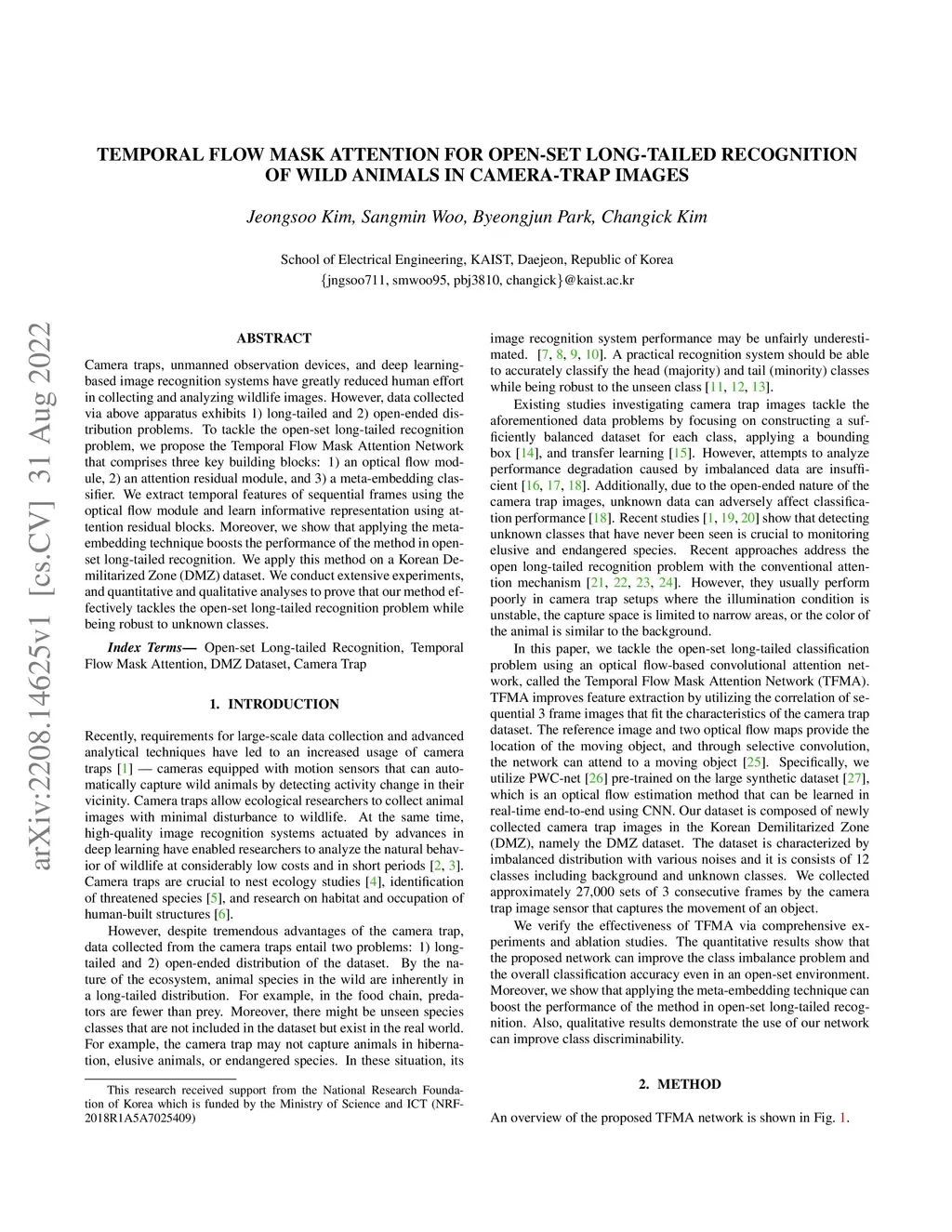 Camera traps, unmanned observation devices, and deep learning-based image recognition systems have greatly reduced human effort in collecting and analyzing wildlife images. However, data collected via above apparatus exhibits 1) long-tailed and 2) open-ended distribution problems. To tackle the open-set long-tailed recognition problem, we propose the Temporal Flow Mask Attention Network that comprises three key building blocks: 1) an optical flow module, 2) an attention residual module, and 3) a meta-embedding classifier. We extract temporal features of sequential frames using the optical flow module and learn informative representation using attention residual blocks. Moreover, we show that applying the meta-embedding technique boosts the performance of the method in open-set long-tailed recognition. We apply this method on a Korean Demilitarized Zone (DMZ) dataset. We conduct extensive experiments, and quantitative and qualitative analyses to prove that our method effectively tackles the open-set long-tailed recognition problem while being robust to unknown classes.