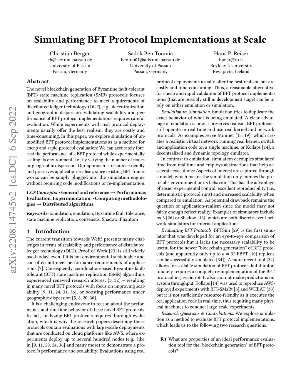 The novel blockchain generation of Byzantine fault-tolerant (BFT) state machine replication (SMR) protocols focuses on scalability and performance to meet requirements of distributed ledger technology (DLT), e.g., decentralization and geographic dispersion. Validating scalability and performance of BFT protocol implementations requires careful evaluation. While experiments with real protocol deployments usually offer the best realism, they are costly and time-consuming. In this paper, we explore simulation of unmodified BFT protocol implementations as as a method for cheap and rapid protocol evaluation: We can accurately forecast the performance of a BFT protocol while experimentally scaling its environment, i.e., by varying the number of nodes or geographic dispersion. Our approach is resource-friendly and preserves application-realism, since existing BFT frameworks can be simply plugged into the simulation engine without requiring code modifications or re-implementation.