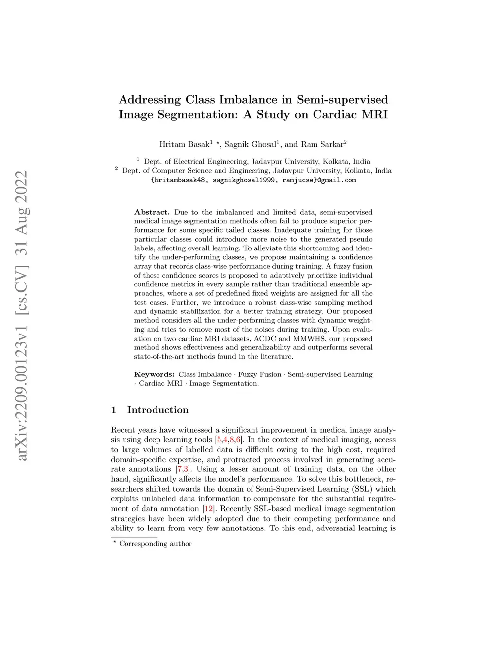 Due to the imbalanced and limited data, semi-supervised medical image segmentation methods often fail to produce superior performance for some specific tailed classes. Inadequate training for those particular classes could introduce more noise to the generated pseudo labels, affecting overall learning. To alleviate this shortcoming and identify the under-performing classes, we propose maintaining a confidence array that records class-wise performance during training. A fuzzy fusion of these confidence scores is proposed to adaptively prioritize individual confidence metrics in every sample rather than traditional ensemble approaches, where a set of predefined fixed weights are assigned for all the test cases. Further, we introduce a robust class-wise sampling method and dynamic stabilization for a better training strategy. Our proposed method considers all the under-performing classes with dynamic weighting and tries to remove most of the noises during training. Upon evaluation on two cardiac MRI datasets, ACDC and MMWHS, our proposed method shows effectiveness and generalizability and outperforms several state-of-the-art methods found in the literature.