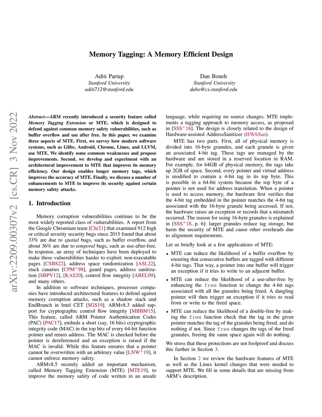 ARM recently introduced a security feature called Memory Tagging Extension or MTE, which is designed to defend against common memory safety vulnerabilities, such as buffer overflow and use after free. In this paper, we examine three aspects of MTE. First, we survey how modern software systems, such as Glibc, Android, Chrome, Linux, and LLVM, use MTE. We identify some common weaknesses and propose improvements. Second, we develop and experiment with an architectural improvement to MTE that improves its memory efficiency. Our design enables longer memory tags, which improves the accuracy of MTE. Finally, we discuss a number of enhancements to MTE to improve its security against certain memory safety attacks.