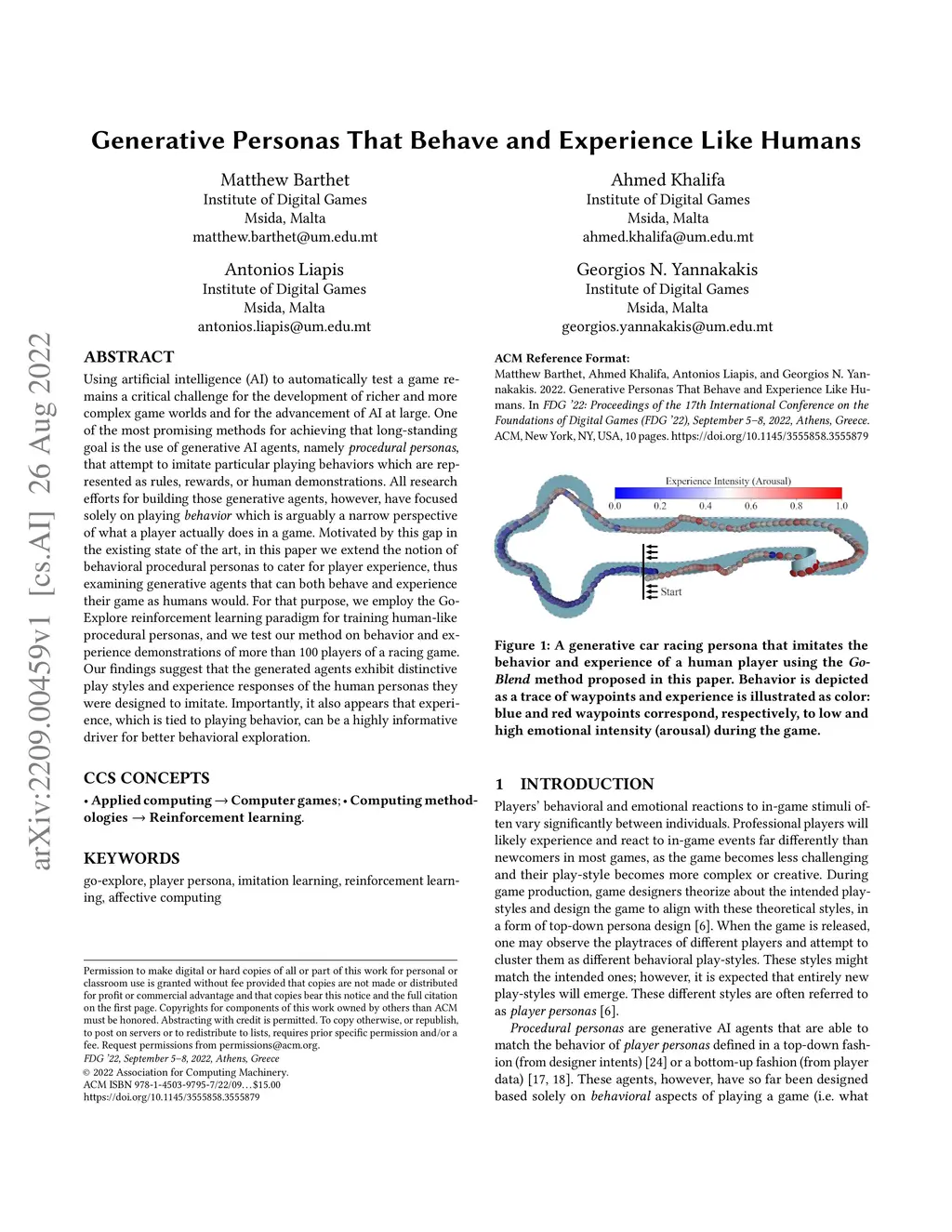 Using artificial intelligence (AI) to automatically test a game remains a critical challenge for the development of richer and more complex game worlds and for the advancement of AI at large. One of the most promising methods for achieving that long-standing goal is the use of generative AI agents, namely procedural personas, that attempt to imitate particular playing behaviors which are represented as rules, rewards, or human demonstrations. All research efforts for building those generative agents, however, have focused solely on playing behavior which is arguably a narrow perspective of what a player actually does in a game. Motivated by this gap in the existing state of the art, in this paper we extend the notion of behavioral procedural personas to cater for player experience, thus examining generative agents that can both behave and experience their game as humans would. For that purpose, we employ the Go-Explore reinforcement learning paradigm for training human-like procedural personas, and we test our method on behavior and experience demonstrations of more than 100 players of a racing game. Our findings suggest that the generated agents exhibit distinctive play styles and experience responses of the human personas they were designed to imitate. Importantly, it also appears that experience, which is tied to playing behavior, can be a highly informative driver for better behavioral exploration.