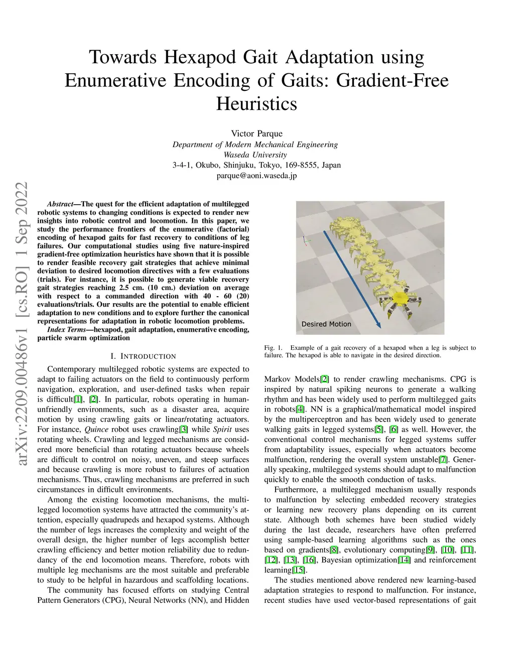 The quest for the efficient adaptation of multilegged robotic systems to changing conditions is expected to render new insights into robotic control and locomotion. In this paper, we study the performance frontiers of the enumerative (factorial) encoding of hexapod gaits for fast recovery to conditions of leg failures. Our computational studies using five nature-inspired gradient-free optimization heuristics have shown that it is possible to render feasible recovery gait strategies that achieve minimal deviation to desired locomotion directives with a few evaluations (trials). For instance, it is possible to generate viable recovery gait strategies reaching 2.5 cm. (10 cm.) deviation on average with respect to a commanded direction with 40 - 60 (20) evaluations/trials. Our results are the potential to enable efficient adaptation to new conditions and to explore further the canonical representations for adaptation in robotic locomotion problems.