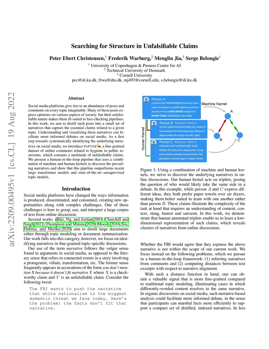 Social media platforms give rise to an abundance of posts and comments on every topic imaginable. Many of these posts express opinions on various aspects of society, but their unfalsifiable nature makes them ill-suited to fact-checking pipelines. In this work, we aim to distill such posts into a small set of narratives that capture the essential claims related to a given topic. Understanding and visualizing these narratives can facilitate more informed debates on social media. As a first step towards systematically identifying the underlying narratives on social media, we introduce PAPYER, a fine-grained dataset of online comments related to hygiene in public restrooms, which contains a multitude of unfalsifiable claims. We present a human-in-the-loop pipeline that uses a combination of machine and human kernels to discover the prevailing narratives and show that this pipeline outperforms recent large transformer models and state-of-the-art unsupervised topic models.