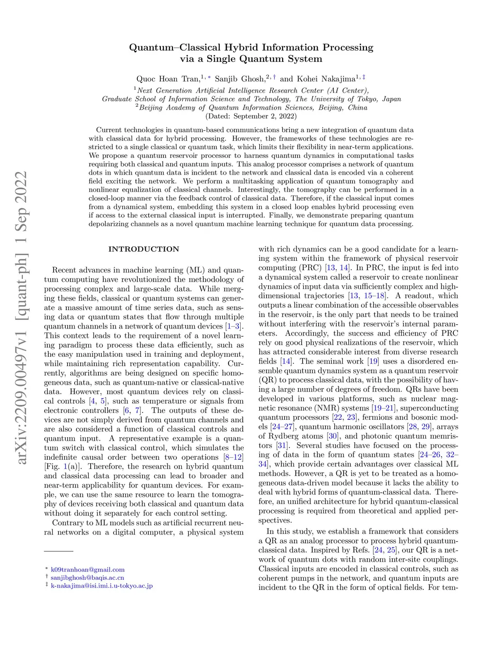 Current technologies in quantum-based communications bring a new integration of quantum data with classical data for hybrid processing. However, the frameworks of these technologies are restricted to a single classical or quantum task, which limits their flexibility in near-term applications. We propose a quantum reservoir processor to harness quantum dynamics in computational tasks requiring both classical and quantum inputs. This analog processor comprises a network of quantum dots in which quantum data is incident to the network and classical data is encoded via a coherent field exciting the network. We perform a multitasking application of quantum tomography and nonlinear equalization of classical channels. Interestingly, the tomography can be performed in a closed-loop manner via the feedback control of classical data. Therefore, if the classical input comes from a dynamical system, embedding this system in a closed loop enables hybrid processing even if access to the external classical input is interrupted. Finally, we demonstrate preparing quantum depolarizing channels as a novel quantum machine learning technique for quantum data processing.