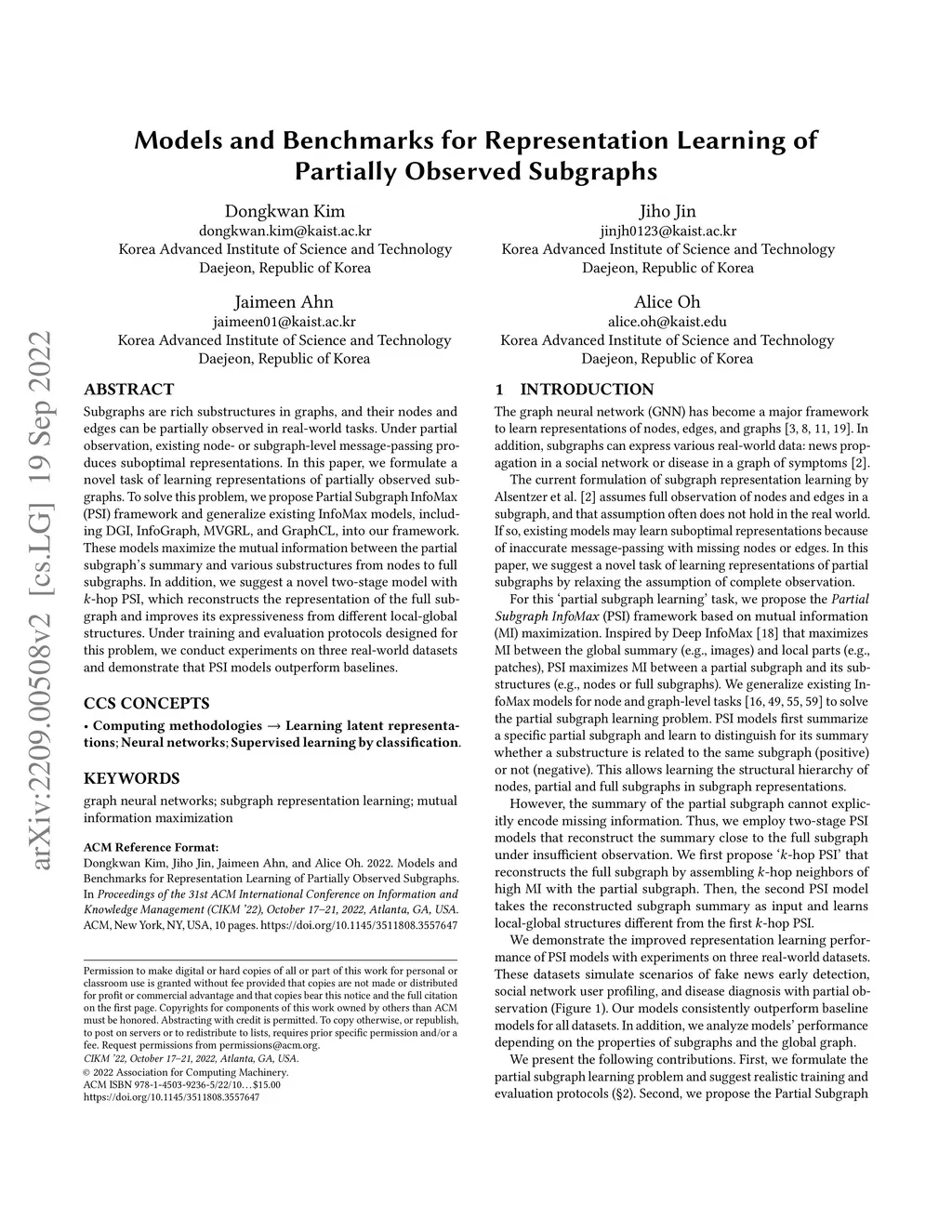 Subgraphs are rich substructures in graphs, and their nodes and edges can be partially observed in real-world tasks. Under partial observation, existing node- or subgraph-level message-passing produces suboptimal representations. In this paper, we formulate a novel task of learning representations of partially observed subgraphs. To solve this problem, we propose Partial Subgraph InfoMax (PSI) framework and generalize existing InfoMax models, including DGI, InfoGraph, MVGRL, and GraphCL, into our framework. These models maximize the mutual information between the partial subgraph's summary and various substructures from nodes to full subgraphs. In addition, we suggest a novel two-stage model with -hop PSI, which reconstructs the representation of the full subgraph and improves its expressiveness from different local-global structures. Under training and evaluation protocols designed for this problem, we conduct experiments on three real-world datasets and demonstrate that PSI models outperform baselines.