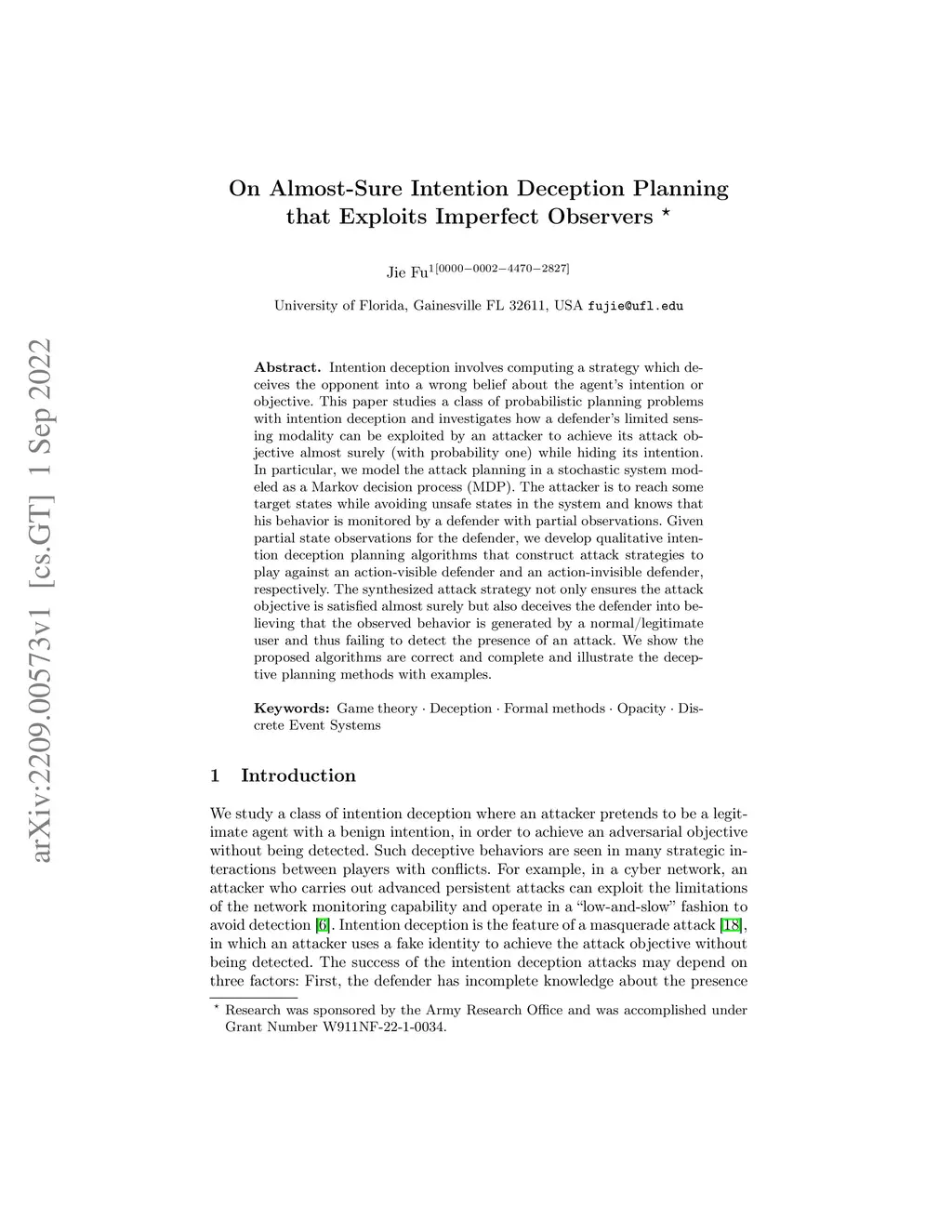 Intention deception involves computing a strategy which deceives the opponent into a wrong belief about the agent's intention or objective. This paper studies a class of probabilistic planning problems with intention deception and investigates how a defender's limited sensing modality can be exploited by an attacker to achieve its attack objective almost surely (with probability one) while hiding its intention. In particular, we model the attack planning in a stochastic system modeled as a Markov decision process (MDP). The attacker is to reach some target states while avoiding unsafe states in the system and knows that his behavior is monitored by a defender with partial observations. Given partial state observations for the defender, we develop qualitative intention deception planning algorithms that construct attack strategies to play against an action-visible defender and an action-invisible defender, respectively. The synthesized attack strategy not only ensures the attack objective is satisfied almost surely but also deceives the defender into believing that the observed behavior is generated by a normal/legitimate user and thus failing to detect the presence of an attack. We show the proposed algorithms are correct and complete and illustrate the deceptive planning methods with examples.