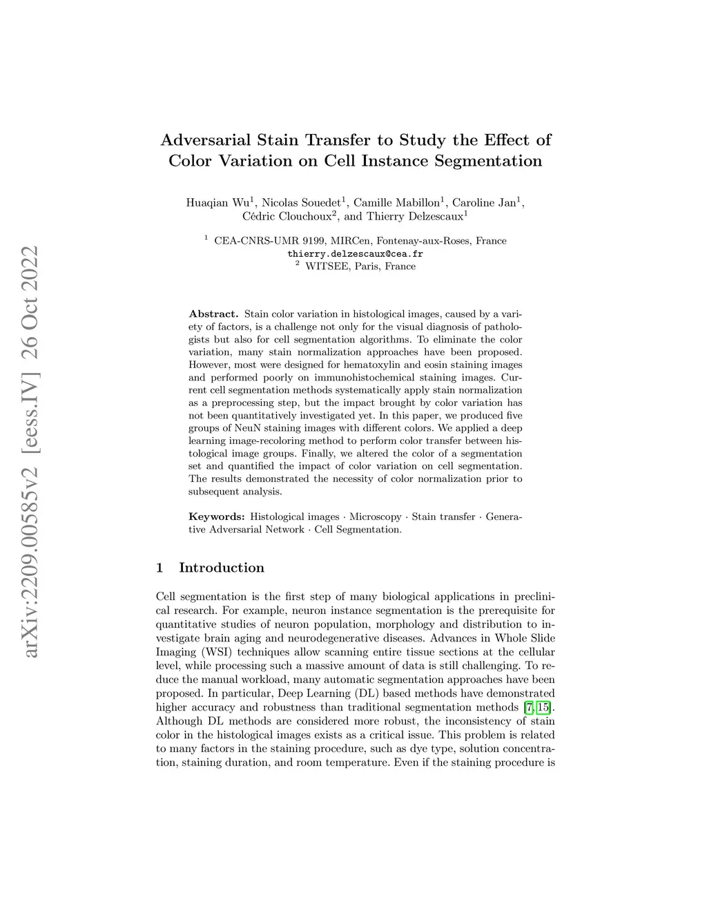 Adversarial Stain Transfer to Study the Effect of Color Variation on