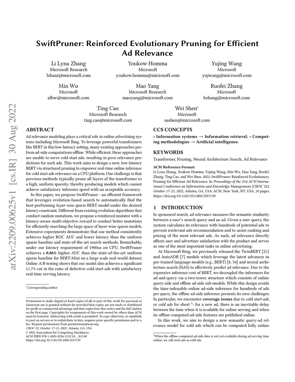 Ad relevance modeling plays a critical role in online advertising systems including Microsoft Bing. To leverage powerful transformers like BERT in this low-latency setting, many existing approaches perform ad-side computations offline. While efficient, these approaches are unable to serve cold start ads, resulting in poor relevance predictions for such ads. This work aims to design a new, low-latency BERT via structured pruning to empower real-time online inference for cold start ads relevance on a CPU platform. Our challenge is that previous methods typically prune all layers of the transformer to a high, uniform sparsity, thereby producing models which cannot achieve satisfactory inference speed with an acceptable accuracy. In this paper, we propose SwiftPruner - an efficient framework that leverages evolution-based search to automatically find the best-performing layer-wise sparse BERT model under the desired latency constraint. Different from existing evolution algorithms that conduct random mutations, we propose a reinforced mutator with a latency-aware multi-objective reward to conduct better mutations for efficiently searching the large space of layer-wise sparse models. Extensive experiments demonstrate that our method consistently achieves higher ROC AUC and lower latency than the uniform sparse baseline and state-of-the-art search methods. Remarkably, under our latency requirement of 1900us on CPU, SwiftPruner achieves a 0.86% higher AUC than the state-of-the-art uniform sparse baseline for BERT-Mini on a large scale real-world dataset. Online A/B testing shows that our model also achieves a significant 11.7% cut in the ratio of defective cold start ads with satisfactory real-time serving latency.