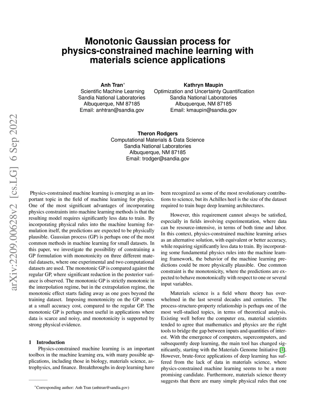 Physics-constrained machine learning is emerging as an important topic in the field of machine learning for physics. One of the most significant advantages of incorporating physics constraints into machine learning methods is that the resulting model requires significantly less data to train. By incorporating physical rules into the machine learning formulation itself, the predictions are expected to be physically plausible. Gaussian process (GP) is perhaps one of the most common methods in machine learning for small datasets. In this paper, we investigate the possibility of constraining a GP formulation with monotonicity on three different material datasets, where one experimental and two computational datasets are used. The monotonic GP is compared against the regular GP, where a significant reduction in the posterior variance is observed. The monotonic GP is strictly monotonic in the interpolation regime, but in the extrapolation regime, the monotonic effect starts fading away as one goes beyond the training dataset. Imposing monotonicity on the GP comes at a small accuracy cost, compared to the regular GP. The monotonic GP is perhaps most useful in applications where data is scarce and noisy, and monotonicity is supported by strong physical evidence.