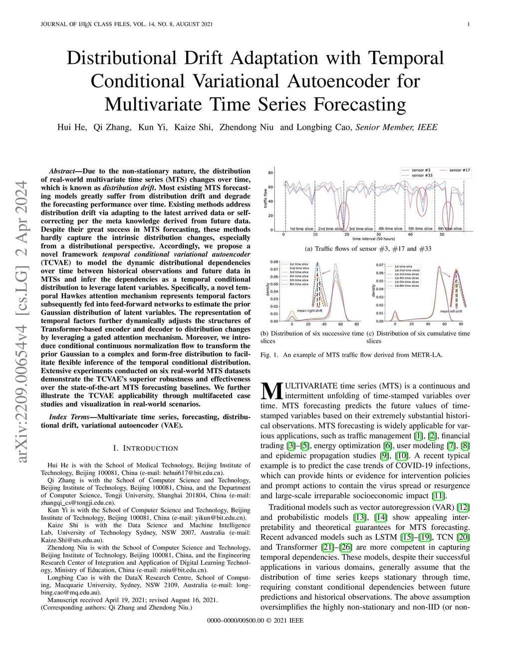 Due to the non-stationary nature, the distribution of real-world multivariate time series (MTS) changes over time, which is known as distribution drift. Most existing MTS forecasting models greatly suffer from distribution drift and degrade the forecasting performance over time. Existing methods address distribution drift via adapting to the latest arrived data or self-correcting per the meta knowledge derived from future data. Despite their great success in MTS forecasting, these methods hardly capture the intrinsic distribution changes, especially from a distributional perspective. Accordingly, we propose a novel framework temporal conditional variational autoencoder (TCVAE) to model the dynamic distributional dependencies over time between historical observations and future data in MTSs and infer the dependencies as a temporal conditional distribution to leverage latent variables. Specifically, a novel temporal Hawkes attention mechanism represents temporal factors subsequently fed into feed-forward networks to estimate the prior Gaussian distribution of latent variables. The representation of temporal factors further dynamically adjusts the structures of Transformer-based encoder and decoder to distribution changes by leveraging a gated attention mechanism. Moreover, we introduce conditional continuous normalization flow to transform the prior Gaussian to a complex and form-free distribution to facilitate flexible inference of the temporal conditional distribution. Extensive experiments conducted on six real-world MTS datasets demonstrate the TCVAE's superior robustness and effectiveness over the state-of-the-art MTS forecasting baselines. We further illustrate the TCVAE applicability through multifaceted case studies and visualization in real-world scenarios.