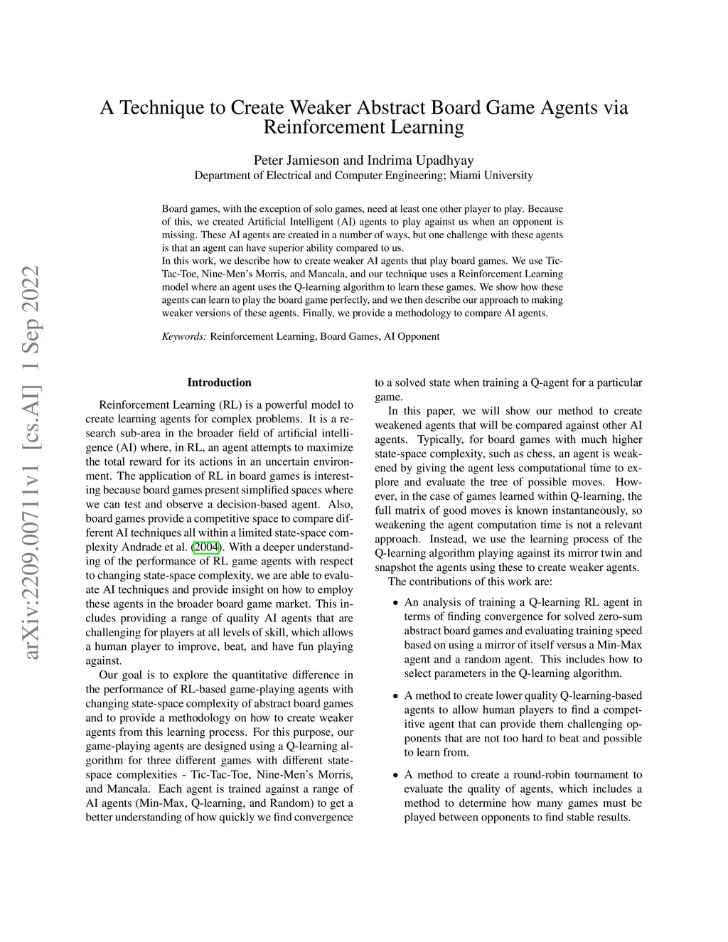 Board games, with the exception of solo games, need at least one other player to play. Because of this, we created Artificial Intelligent (AI) agents to play against us when an opponent is missing. These AI agents are created in a number of ways, but one challenge with these agents is that an agent can have superior ability compared to us. In this work, we describe how to create weaker AI agents that play board games. We use Tic-Tac-Toe, Nine-Men's Morris, and Mancala, and our technique uses a Reinforcement Learning model where an agent uses the Q-learning algorithm to learn these games. We show how these agents can learn to play the board game perfectly, and we then describe our approach to making weaker versions of these agents. Finally, we provide a methodology to compare AI agents.