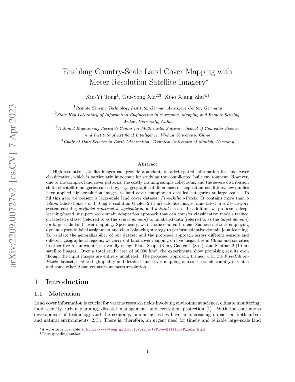 High-resolution satellite images can provide abundant, detailed spatial information for land cover classification, which is particularly important for studying the complicated built environment. However, due to the complex land cover patterns, the costly training sample collections, and the severe distribution shifts of satellite imageries, few studies have applied high-resolution images to land cover mapping in detailed categories at large scale. To fill this gap, we present a large-scale land cover dataset, Five-Billion-Pixels. It contains more than 5 billion labeled pixels of 150 high-resolution Gaofen-2 (4 m) satellite images, annotated in a 24-category system covering artificial-constructed, agricultural, and natural classes. In addition, we propose a deep-learning-based unsupervised domain adaptation approach that can transfer classification models trained on labeled dataset (referred to as the source domain) to unlabeled data (referred to as the target domain) for large-scale land cover mapping. Specifically, we introduce an end-to-end Siamese network employing dynamic pseudo-label assignment and class balancing strategy to perform adaptive domain joint learning. To validate the generalizability of our dataset and the proposed approach across different sensors and different geographical regions, we carry out land cover mapping on five megacities in China and six cities in other five Asian countries severally using: PlanetScope (3 m), Gaofen-1 (8 m), and Sentinel-2 (10 m) satellite images. Over a total study area of 60,000 square kilometers, the experiments show promising results even though the input images are entirely unlabeled. The proposed approach, trained with the Five-Billion-Pixels dataset, enables high-quality and detailed land cover mapping across the whole country of China and some other Asian countries at meter-resolution.