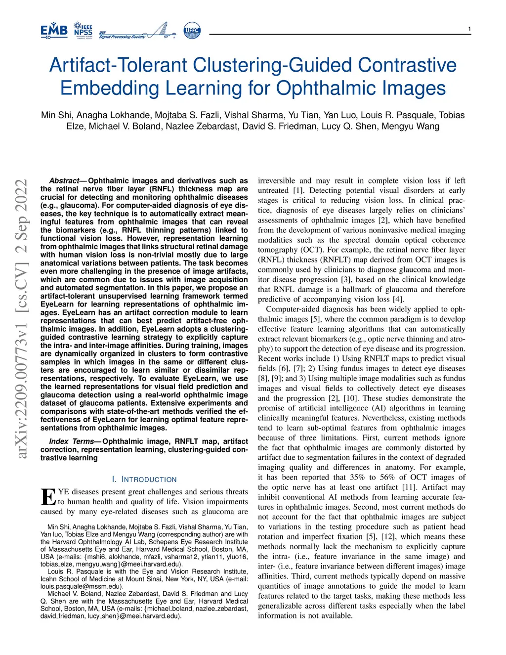 Ophthalmic images and derivatives such as the retinal nerve fiber layer (RNFL) thickness map are crucial for detecting and monitoring ophthalmic diseases (e.g., glaucoma). For computer-aided diagnosis of eye diseases, the key technique is to automatically extract meaningful features from ophthalmic images that can reveal the biomarkers (e.g., RNFL thinning patterns) linked to functional vision loss. However, representation learning from ophthalmic images that links structural retinal damage with human vision loss is non-trivial mostly due to large anatomical variations between patients. The task becomes even more challenging in the presence of image artifacts, which are common due to issues with image acquisition and automated segmentation. In this paper, we propose an artifact-tolerant unsupervised learning framework termed EyeLearn for learning representations of ophthalmic images. EyeLearn has an artifact correction module to learn representations that can best predict artifact-free ophthalmic images. In addition, EyeLearn adopts a clustering-guided contrastive learning strategy to explicitly capture the intra- and inter-image affinities. During training, images are dynamically organized in clusters to form contrastive samples in which images in the same or different clusters are encouraged to learn similar or dissimilar representations, respectively. To evaluate EyeLearn, we use the learned representations for visual field prediction and glaucoma detection using a real-world ophthalmic image dataset of glaucoma patients. Extensive experiments and comparisons with state-of-the-art methods verified the effectiveness of EyeLearn for learning optimal feature representations from ophthalmic images.