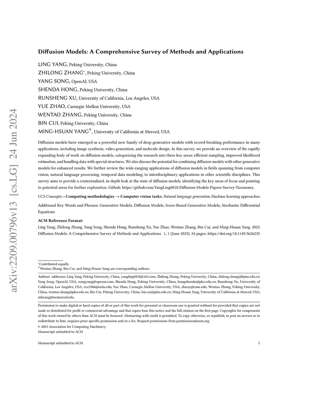 Diffusion models have emerged as a powerful new family of deep generative models with record-breaking performance in many applications, including image synthesis, video generation, and molecule design. In this survey, we provide an overview of the rapidly expanding body of work on diffusion models, categorizing the research into three key areas: efficient sampling, improved likelihood estimation, and handling data with special structures. We also discuss the potential for combining diffusion models with other generative models for enhanced results. We further review the wide-ranging applications of diffusion models in fields spanning from computer vision, natural language generation, temporal data modeling, to interdisciplinary applications in other scientific disciplines. This survey aims to provide a contextualized, in-depth look at the state of diffusion models, identifying the key areas of focus and pointing to potential areas for further exploration. Github: https://github.com/YangLing0818/Diffusion-Models-Papers-Survey-Taxonomy.