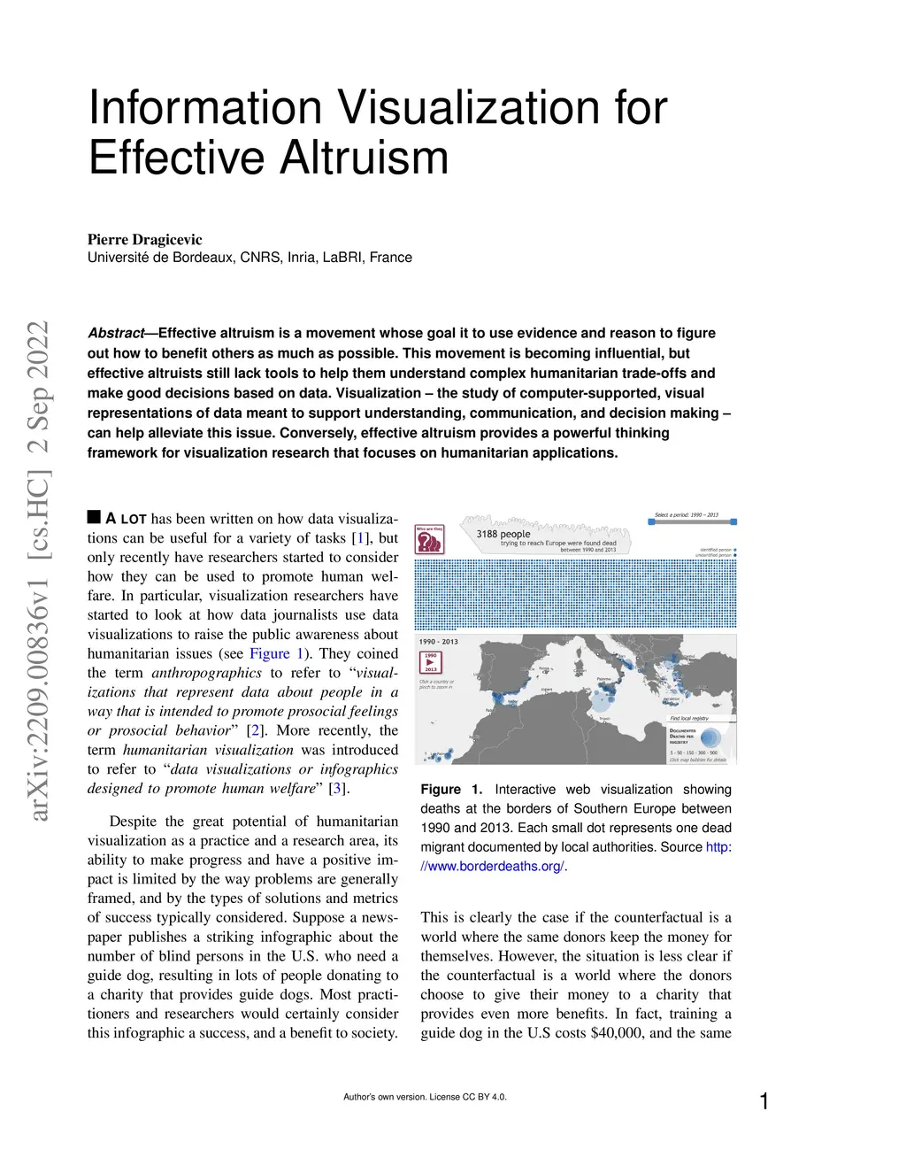 Effective altruism is a movement whose goal it to use evidence and reason to figure out how to benefit others as much as possible. This movement is becoming influential, but effective altruists still lack tools to help them understand complex humanitarian trade-offs and make good decisions based on data. Visualization-the study of computer-supported, visual representations of data meant to support understanding, communication, and decision makingcan help alleviate this issue. Conversely, effective altruism provides a powerful thinking framework for visualization research that focuses on humanitarian applications.
