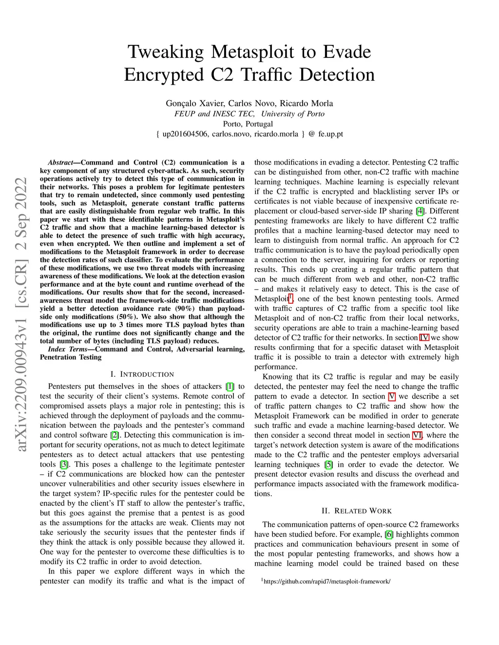 Command and Control (C2) communication is a key component of any structured cyber-attack. As such, security operations actively try to detect this type of communication in their networks. This poses a problem for legitimate pentesters that try to remain undetected, since commonly used pentesting tools, such as Metasploit, generate constant traffic patterns that are easily distinguishable from regular web traffic. In this paper we start with these identifiable patterns in Metasploit's C2 traffic and show that a machine learning-based detector is able to detect the presence of such traffic with high accuracy, even when encrypted. We then outline and implement a set of modifications to the Metasploit framework in order to decrease the detection rates of such classifier. To evaluate the performance of these modifications, we use two threat models with increasing awareness of these modifications. We look at the detection evasion performance and at the byte count and runtime overhead of the modifications. Our results show that for the second, increased-awareness threat model the framework-side traffic modifications yield a better detection avoidance rate (90%) than payload-side only modifications (50%). We also show that although the modifications use up to 3 times more TLS payload bytes than the original, the runtime does not significantly change and the total number of bytes (including TLS payload) reduces.