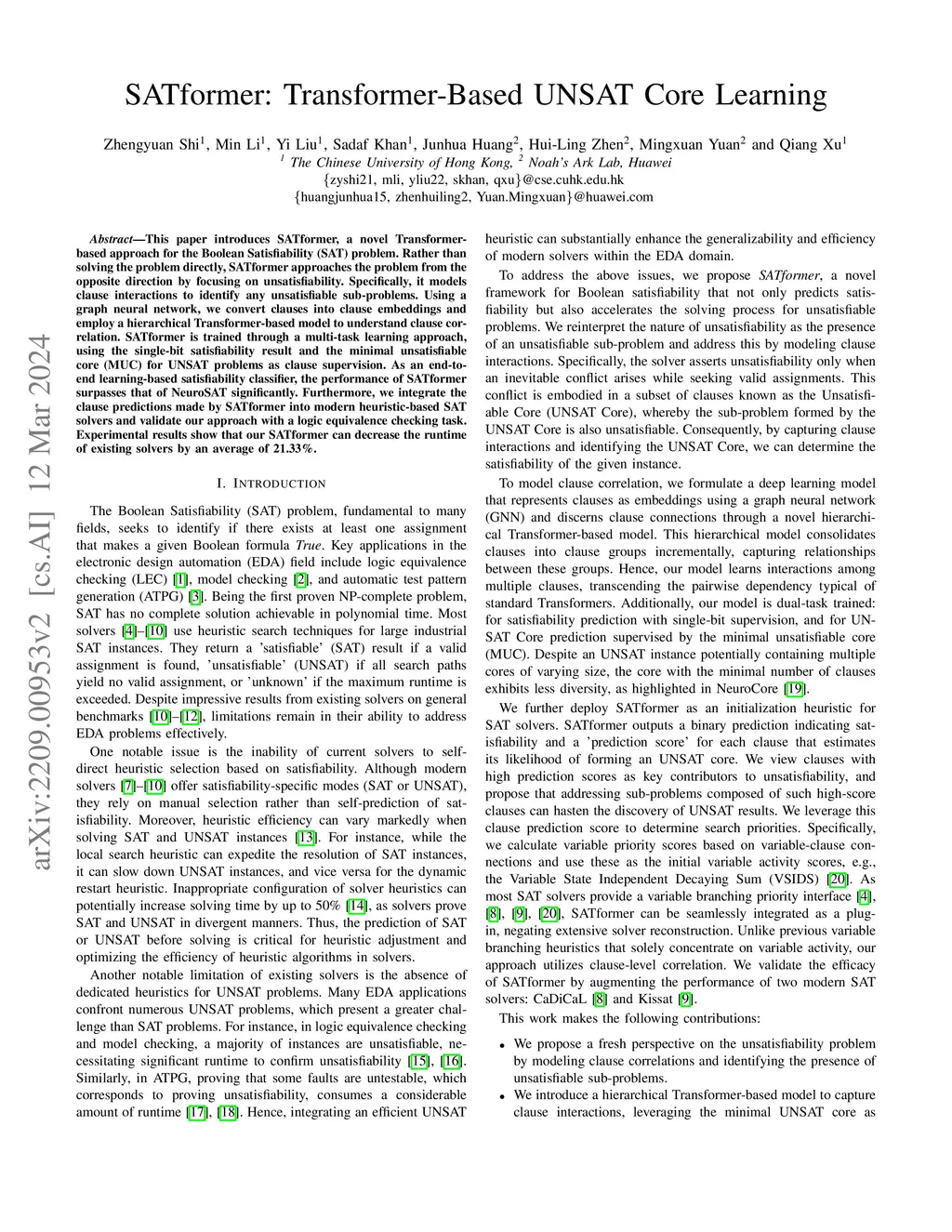 This paper introduces SATformer, a novel Transformer-based approach for the Boolean Satisfiability (SAT) problem. Rather than solving the problem directly, SATformer approaches the problem from the opposite direction by focusing on unsatisfiability. Specifically, it models clause interactions to identify any unsatisfiable sub-problems. Using a graph neural network, we convert clauses into clause embeddings and employ a hierarchical Transformer-based model to understand clause correlation. SATformer is trained through a multi-task learning approach, using the single-bit satisfiability result and the minimal unsatisfiable core (MUC) for UNSAT problems as clause supervision. As an end-to-end learning-based satisfiability classifier, the performance of SATformer surpasses that of NeuroSAT significantly. Furthermore, we integrate the clause predictions made by SATformer into modern heuristic-based SAT solvers and validate our approach with a logic equivalence checking task. Experimental results show that our SATformer can decrease the runtime of existing solvers by an average of 21.33%.