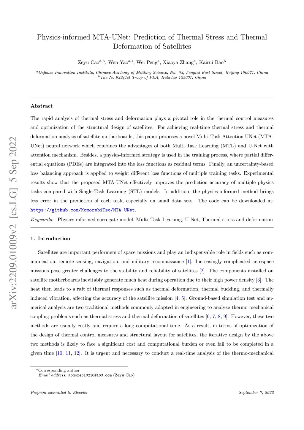 The rapid analysis of thermal stress and deformation plays a pivotal role in the thermal control measures and optimization of the structural design of satellites. For achieving real-time thermal stress and thermal deformation analysis of satellite motherboards, this paper proposes a novel Multi-Task Attention UNet (MTA-UNet) neural network which combines the advantages of both Multi-Task Learning (MTL) and U-Net with attention mechanism. Besides, a physics-informed strategy is used in the training process, where partial differential equations (PDEs) are integrated into the loss functions as residual terms. Finally, an uncertainty-based loss balancing approach is applied to weight different loss functions of multiple training tasks. Experimental results show that the proposed MTA-UNet effectively improves the prediction accuracy of multiple physics tasks compared with Single-Task Learning (STL) models. In addition, the physics-informed method brings less error in the prediction of each task, especially on small data sets. The code can be downloaded at: \url{https://github.com/KomorebiTso/MTA-UNet}.