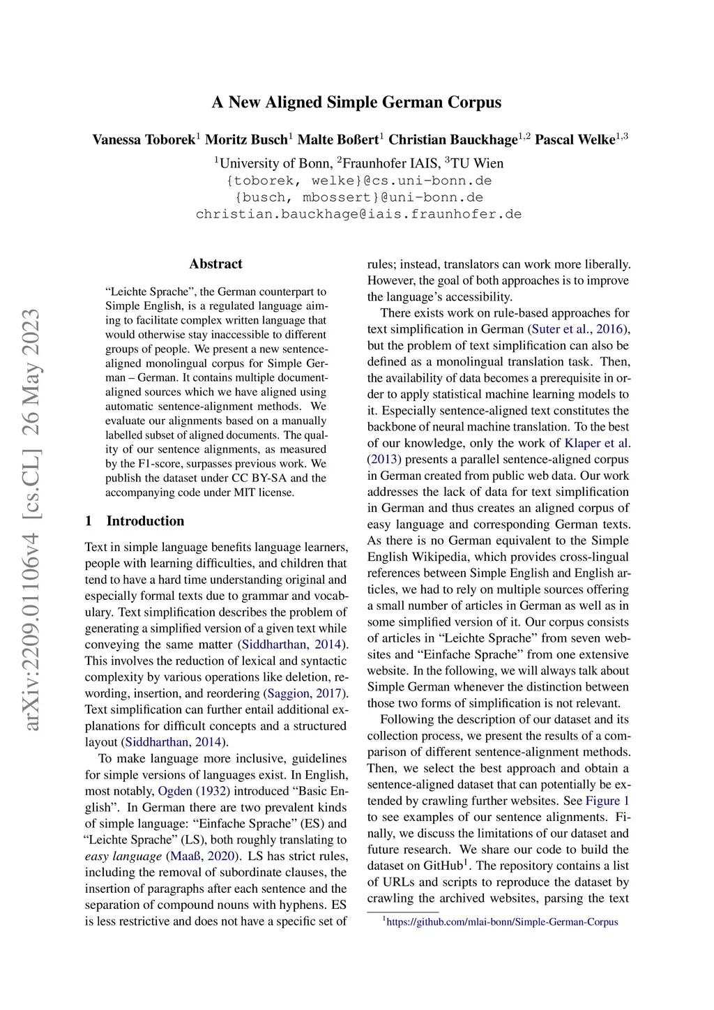 "Leichte Sprache", the German counterpart to Simple English, is a regulated language aiming to facilitate complex written language that would otherwise stay inaccessible to different groups of people. We present a new sentence-aligned monolingual corpus for Simple German -- German. It contains multiple document-aligned sources which we have aligned using automatic sentence-alignment methods. We evaluate our alignments based on a manually labelled subset of aligned documents. The quality of our sentence alignments, as measured by F1-score, surpasses previous work. We publish the dataset under CC BY-SA and the accompanying code under MIT license.