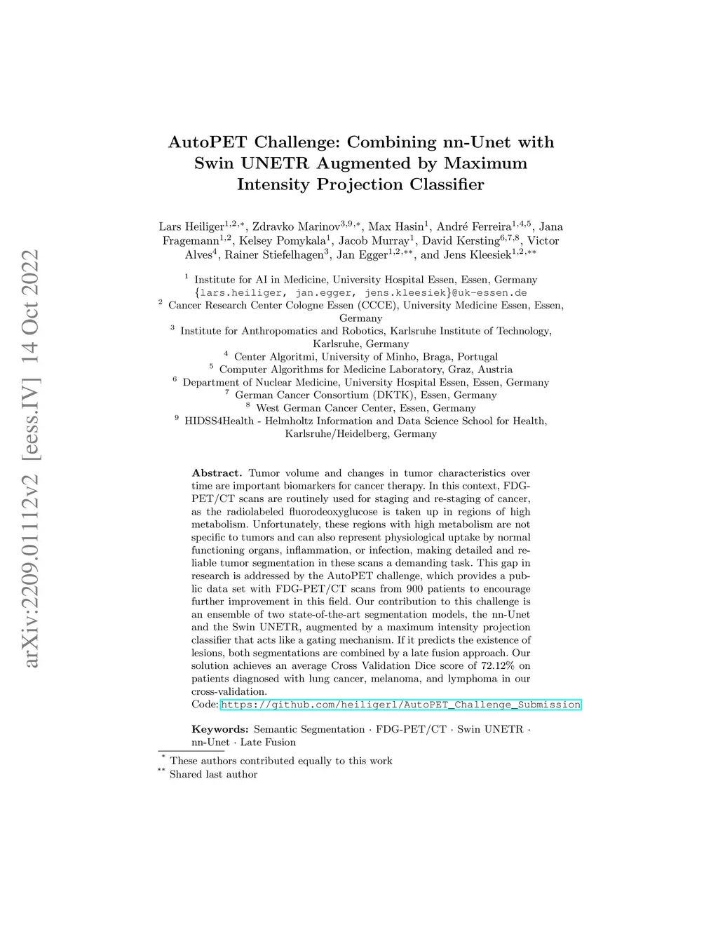 Tumor volume and changes in tumor characteristics over time are important biomarkers for cancer therapy. In this context, FDG-PET/CT scans are routinely used for staging and re-staging of cancer, as the radiolabeled fluorodeoxyglucose is taken up in regions of high metabolism. Unfortunately, these regions with high metabolism are not specific to tumors and can also represent physiological uptake by normal functioning organs, inflammation, or infection, making detailed and reliable tumor segmentation in these scans a demanding task. This gap in research is addressed by the AutoPET challenge, which provides a public data set with FDG-PET/CT scans from 900 patients to encourage further improvement in this field. Our contribution to this challenge is an ensemble of two state-of-the-art segmentation models, the nn-Unet and the Swin UNETR, augmented by a maximum intensity projection classifier that acts like a gating mechanism. If it predicts the existence of lesions, both segmentations are combined by a late fusion approach. Our solution achieves a Dice score of 72.12\% on patients diagnosed with lung cancer, melanoma, and lymphoma in our cross-validation. Code: https://github.com/heiligerl/autopet_submission