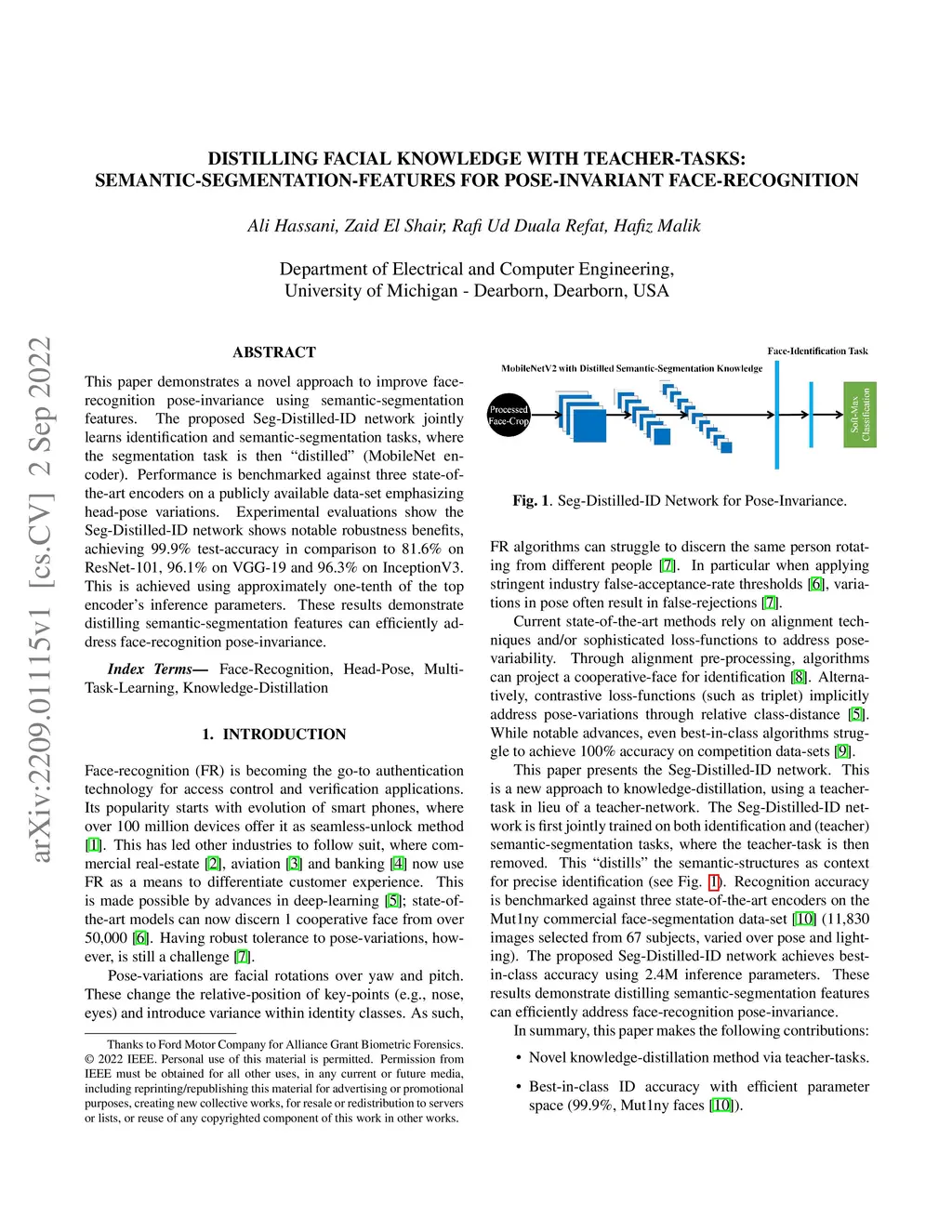 This paper demonstrates a novel approach to improve face-recognition pose-invariance using semantic-segmentation features. The proposed Seg-Distilled-ID network jointly learns identification and semantic-segmentation tasks, where the segmentation task is then "distilled" (MobileNet encoder). Performance is benchmarked against three state-of-the-art encoders on a publicly available data-set emphasizing head-pose variations. Experimental evaluations show the Seg-Distilled-ID network shows notable robustness benefits, achieving 99.9% test-accuracy in comparison to 81.6% on ResNet-101, 96.1% on VGG-19 and 96.3% on InceptionV3. This is achieved using approximately one-tenth of the top encoder's inference parameters. These results demonstrate distilling semantic-segmentation features can efficiently address face-recognition pose-invariance.