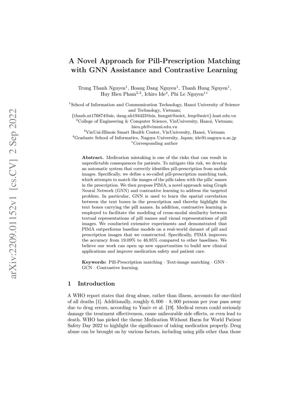 Medication mistaking is one of the risks that can result in unpredictable consequences for patients. To mitigate this risk, we develop an automatic system that correctly identifies pill-prescription from mobile images. Specifically, we define a so-called pill-prescription matching task, which attempts to match the images of the pills taken with the pills' names in the prescription. We then propose PIMA, a novel approach using Graph Neural Network (GNN) and contrastive learning to address the targeted problem. In particular, GNN is used to learn the spatial correlation between the text boxes in the prescription and thereby highlight the text boxes carrying the pill names. In addition, contrastive learning is employed to facilitate the modeling of cross-modal similarity between textual representations of pill names and visual representations of pill images. We conducted extensive experiments and demonstrated that PIMA outperforms baseline models on a real-world dataset of pill and prescription images that we constructed. Specifically, PIMA improves the accuracy from 19.09% to 46.95% compared to other baselines. We believe our work can open up new opportunities to build new clinical applications and improve medication safety and patient care.