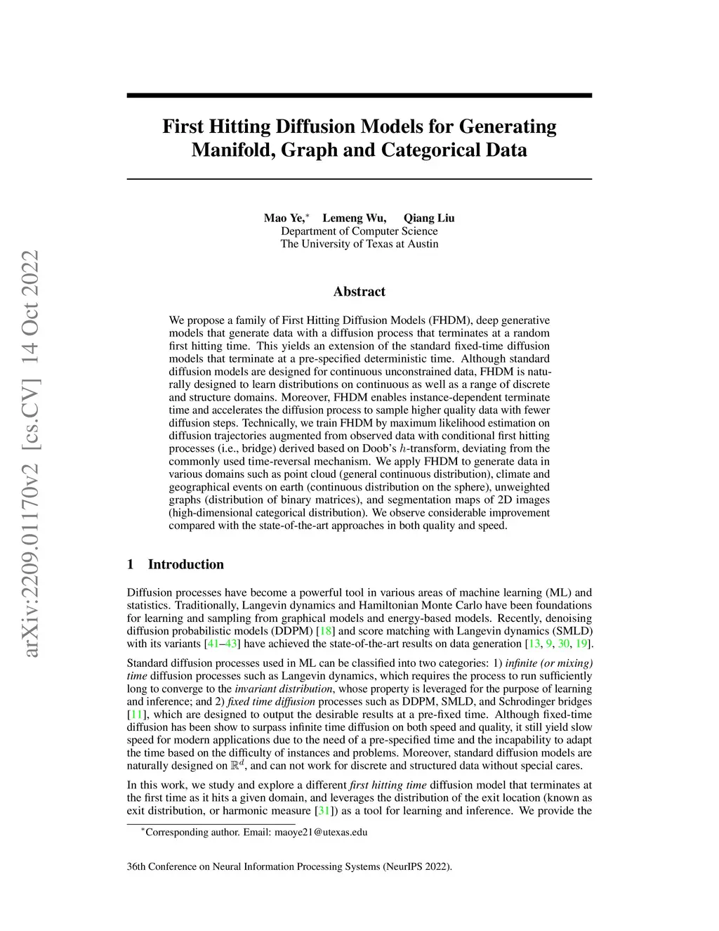 We propose a family of First Hitting Diffusion Models (FHDM), deep generative models that generate data with a diffusion process that terminates at a random first hitting time. This yields an extension of the standard fixed-time diffusion models that terminate at a pre-specified deterministic time. Although standard diffusion models are designed for continuous unconstrained data, FHDM is naturally designed to learn distributions on continuous as well as a range of discrete and structure domains. Moreover, FHDM enables instance-dependent terminate time and accelerates the diffusion process to sample higher quality data with fewer diffusion steps. Technically, we train FHDM by maximum likelihood estimation on diffusion trajectories augmented from observed data with conditional first hitting processes (i.e., bridge) derived based on Doob's -transform, deviating from the commonly used time-reversal mechanism. We apply FHDM to generate data in various domains such as point cloud (general continuous distribution), climate and geographical events on earth (continuous distribution on the sphere), unweighted graphs (distribution of binary matrices), and segmentation maps of 2D images (high-dimensional categorical distribution). We observe considerable improvement compared with the state-of-the-art approaches in both quality and speed.