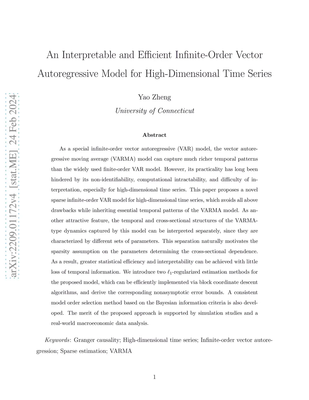 As a special infinite-order vector autoregressive (VAR) model, the vector autoregressive moving average (VARMA) model can capture much richer temporal patterns than the widely used finite-order VAR model. However, its practicality has long been hindered by its non-identifiability, computational intractability, and difficulty of interpretation, especially for high-dimensional time series. This paper proposes a novel sparse infinite-order VAR model for high-dimensional time series, which avoids all above drawbacks while inheriting essential temporal patterns of the VARMA model. As another attractive feature, the temporal and cross-sectional structures of the VARMA-type dynamics captured by this model can be interpreted separately, since they are characterized by different sets of parameters. This separation naturally motivates the sparsity assumption on the parameters determining the cross-sectional dependence. As a result, greater statistical efficiency and interpretability can be achieved with little loss of temporal information. We introduce two -regularized estimation methods for the proposed model, which can be efficiently implemented via block coordinate descent algorithms, and derive the corresponding nonasymptotic error bounds. A consistent model order selection method based on the Bayesian information criteria is also developed. The merit of the proposed approach is supported by simulation studies and a real-world macroeconomic data analysis.