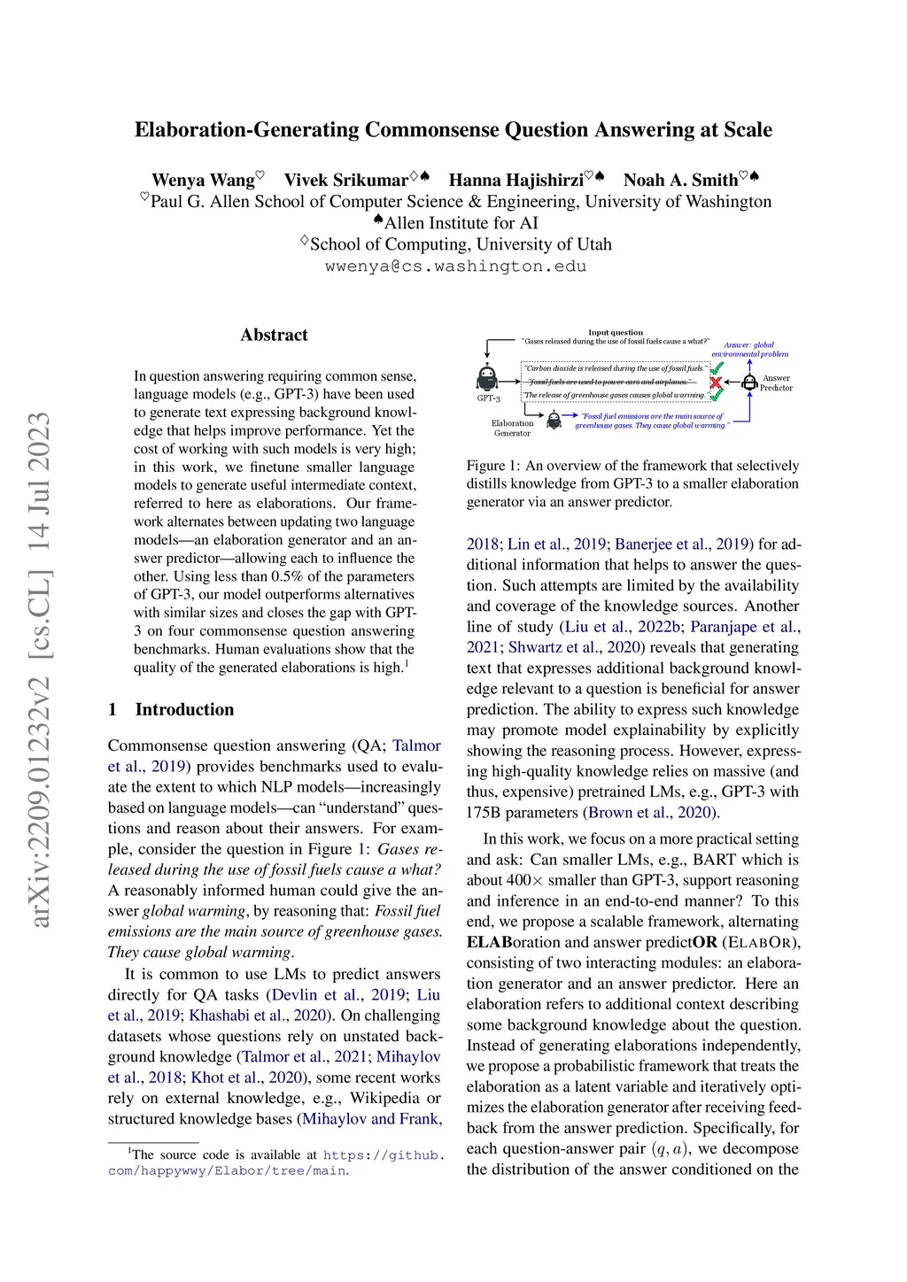 In question answering requiring common sense, language models (e.g., GPT-3) have been used to generate text expressing background knowledge that helps improve performance. Yet the cost of working with such models is very high; in this work, we finetune smaller language models to generate useful intermediate context, referred to here as elaborations. Our framework alternates between updating two language models -- an elaboration generator and an answer predictor -- allowing each to influence the other. Using less than 0.5% of the parameters of GPT-3, our model outperforms alternatives with similar sizes and closes the gap on GPT-3 on four commonsense question answering benchmarks. Human evaluations show that the quality of the generated elaborations is high.