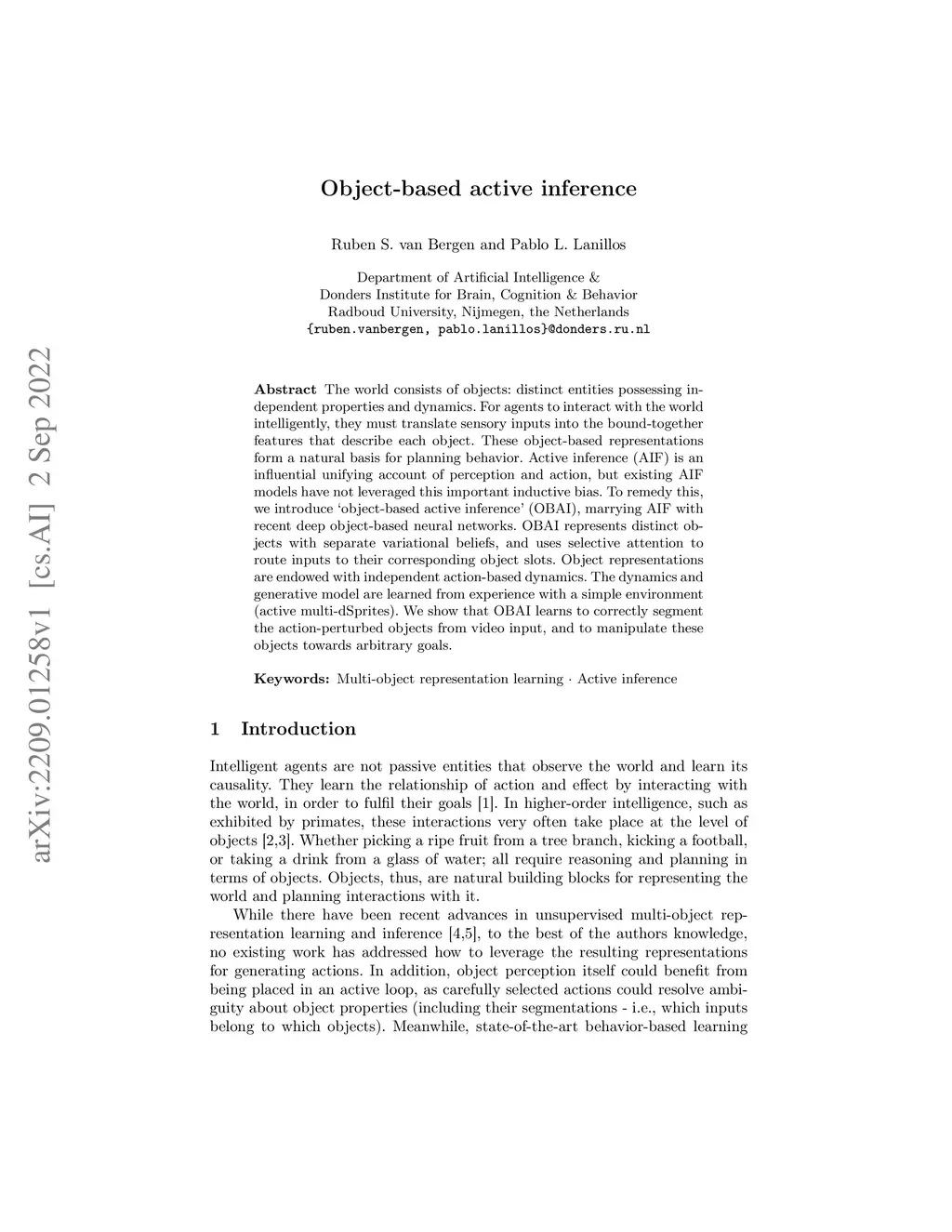 The world consists of objects: distinct entities possessing independent properties and dynamics. For agents to interact with the world intelligently, they must translate sensory inputs into the bound-together features that describe each object. These object-based representations form a natural basis for planning behavior. Active inference (AIF) is an influential unifying account of perception and action, but existing AIF models have not leveraged this important inductive bias. To remedy this, we introduce óbject-based active inference' (OBAI), marrying AIF with recent deep object-based neural networks. OBAI represents distinct objects with separate variational beliefs, and uses selective attention to route inputs to their corresponding object slots. Object representations are endowed with independent action-based dynamics. The dynamics and generative model are learned from experience with a simple environment (active multi-dSprites). We show that OBAI learns to correctly segment the action-perturbed objects from video input, and to manipulate these objects towards arbitrary goals.