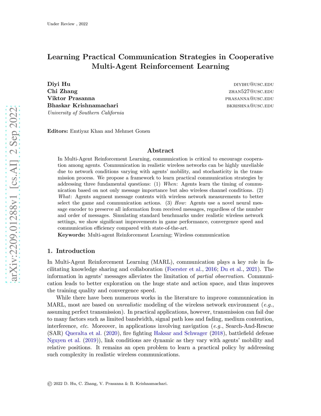 In Multi-Agent Reinforcement Learning, communication is critical to encourage cooperation among agents. Communication in realistic wireless networks can be highly unreliable due to network conditions varying with agents' mobility, and stochasticity in the transmission process. We propose a framework to learn practical communication strategies by addressing three fundamental questions: (1) When: Agents learn the timing of communication based on not only message importance but also wireless channel conditions. (2) What: Agents augment message contents with wireless network measurements to better select the game and communication actions. (3) How: Agents use a novel neural message encoder to preserve all information from received messages, regardless of the number and order of messages. Simulating standard benchmarks under realistic wireless network settings, we show significant improvements in game performance, convergence speed and communication efficiency compared with state-of-the-art.