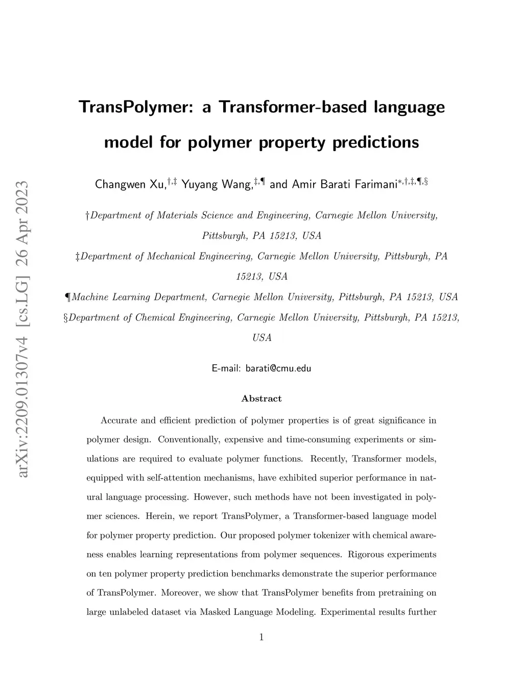 Accurate and efficient prediction of polymer properties is of great significance in polymer design. Conventionally, expensive and time-consuming experiments or simulations are required to evaluate polymer functions. Recently, Transformer models, equipped with self-attention mechanisms, have exhibited superior performance in natural language processing. However, such methods have not been investigated in polymer sciences. Herein, we report TransPolymer, a Transformer-based language model for polymer property prediction. Our proposed polymer tokenizer with chemical awareness enables learning representations from polymer sequences. Rigorous experiments on ten polymer property prediction benchmarks demonstrate the superior performance of TransPolymer. Moreover, we show that TransPolymer benefits from pretraining on large unlabeled dataset via Masked Language Modeling. Experimental results further manifest the important role of self-attention in modeling polymer sequences. We highlight this model as a promising computational tool for promoting rational polymer design and understanding structure-property relationships from a data science view.