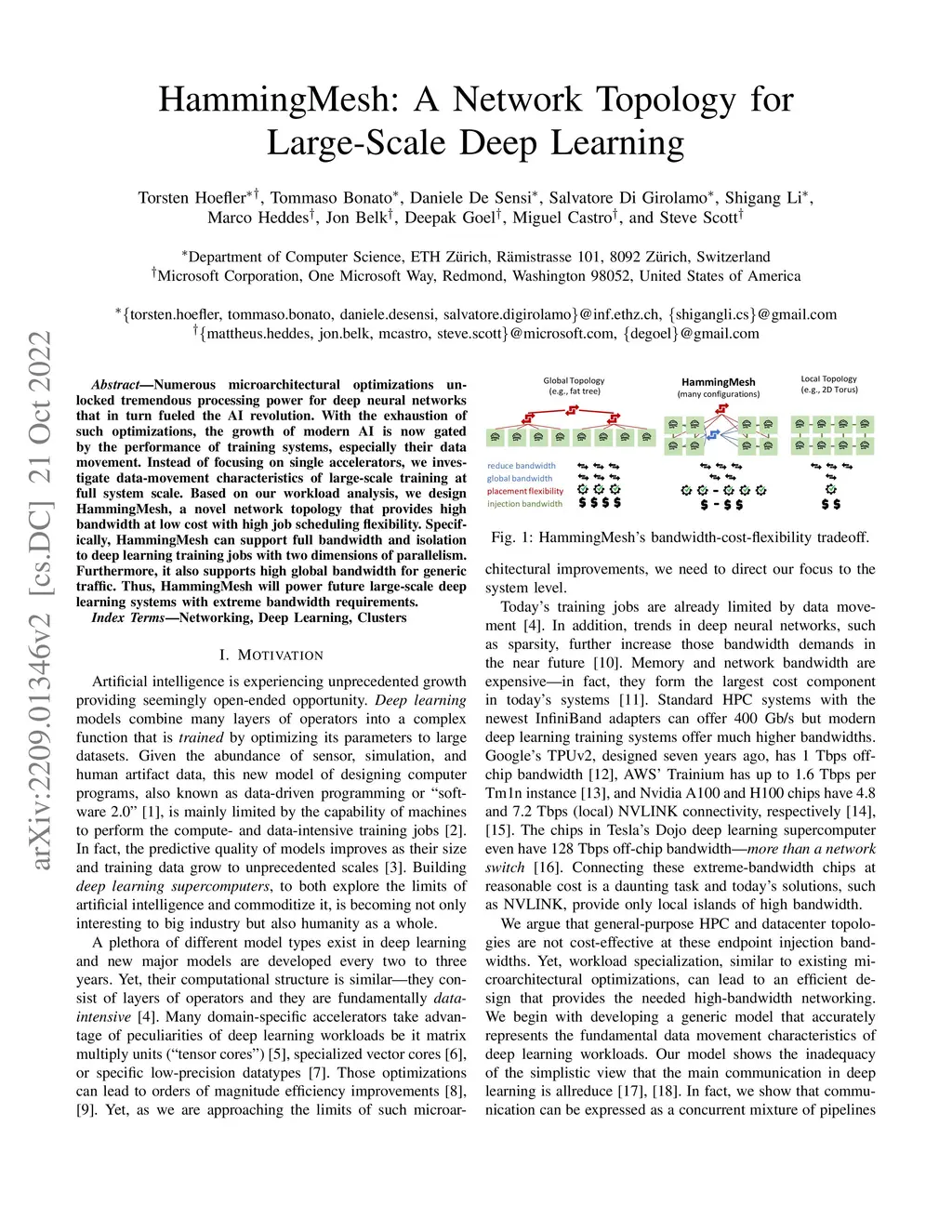 Numerous microarchitectural optimizations unlocked tremendous processing power for deep neural networks that in turn fueled the AI revolution. With the exhaustion of such optimizations, the growth of modern AI is now gated by the performance of training systems, especially their data movement. Instead of focusing on single accelerators, we investigate data-movement characteristics of large-scale training at full system scale. Based on our workload analysis, we design HammingMesh, a novel network topology that provides high bandwidth at low cost with high job scheduling flexibility. Specifically, HammingMesh can support full bandwidth and isolation to deep learning training jobs with two dimensions of parallelism. Furthermore, it also supports high global bandwidth for generic traffic. Thus, HammingMesh will power future large-scale deep learning systems with extreme bandwidth requirements.